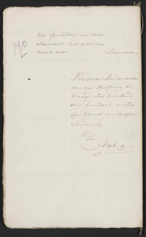 tig guldens en twee stuivers, het geene des diend voor Memorie Prima Summa van den Ontfang be¬ draagd zes duizend vier honderd en zes guldens en negen stuivers, Dus ƒ 6 to 6 „ 9 Cunnen
