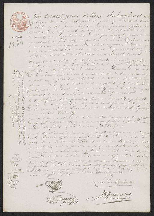 Par devant jozua Willem Hoekwater et son Collègue tous deux Notaires Imperiaux residans dans la ville de Schiedam chef lieu du cinquieme Canton du second Arrondissement du departement des bouches de la meuse furent present les sieurs Jan Loopuyt, Conseiller No. 82 municipal de cette ville et Courtier, et Simon Pignbende, aus„ 264 si conseiller municipal de cette ville et negociant tous deux demeurans dans cette ville au canal le premier section C N.o 18 et le Second Section A N.o 13 de nous Notaires connus Les quels ont certifié et attesté pour notorité avoir parfaite„ ment connu Dame Maria Lotens vende de Gerrit on Gerard Bur gerhoudt, qu’elle est décèdée à Schiedam en Hollande le dix neuf Aout milhuit cent dix, ainsi qu'il resulte de son mortuaire inschit aux registres de cette ville à la date du Vingt deux du 5 même mois, qu après son decès il n'a pas été fait d'inventaire juridique de ses biens et qu'elle à laisse pour seuls et uniques heritiers legaux et naturels ses quatre enfans, sadois: le siens Gerardus Burgerhoudt, la dame Maria Burgerhondt pouse du Sieur Jan Rodenburg et le sieur Johannes Burger hondt demeurans a Schiedam, et le sieur Jacobus Burgerhoudt demeurant à Stavenisse 8/8 que si l'on a constate dans son mootuaire qu'elle laissoit vingt sept enfans c'est que l'on a compris sous cette den omi nation ses petits enfans et arriere petits infans que c'est par erreur si, dans une inscription tragère de cent qua„ rante Francs expedice au profit de La dite Dame sous le n.o 39154, elle a été nommée Lootens au lieu de Lotens qui étoit son veritable nom de famille ainsi qu'il resulte de son acte de naissance inscrit aux registres de l'état civil de la com„ mune de Delft à la date du 5 mai mil sept cent trente trois sing approude Dont acte fait et passé in l'étude du dit Notaire Hoekwater le dix J L neuf octobre michuit cent treize, avant midi et ont les Comparants adec les Notaires signé après lecture faite la présente minute la quelle est S R B. restee en la garde et possession du Notaire Hoekwater susdit. J.W.H J S G Simon Rijnbende a Heer Hoekwater J.M.R. Nots. Impert. Penning Notaire Junior