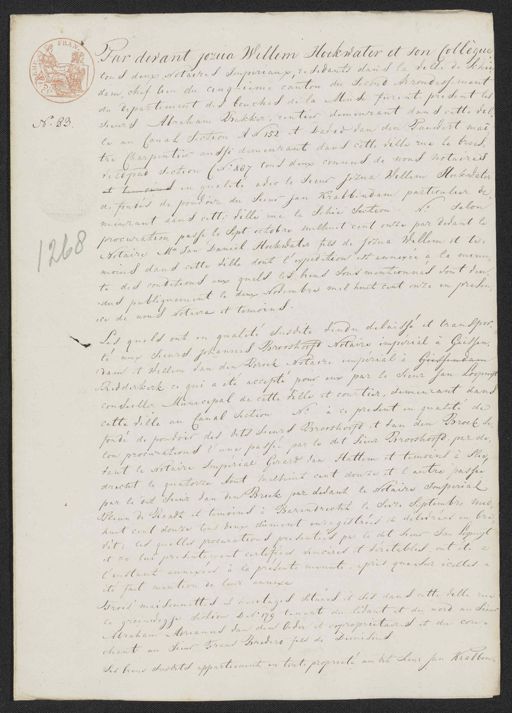 Par devant Jozua Willem Hoekwater et son Collègue tous deux Notaires Imperiaux, residants dans la ville de Schie„ dam chef lieu du cinquieme canton du second Arrondissement du departement des bouches de la Meuse furent, present les sieurs Abraham Bakker, rentier demeurant dans cette vil No. 83 le an Canal Section A N 152 et David van den Pauwert mai„ tre Charpentier aussi demeurant dans cette ville rue le broes„ veldpad Section C No. 487 tous deux connus de nous notaires et temoins en qualité adic le sieur Jozna Willem Hoekwater de fondés de pouvoir du Sieur Jan Krabbendam particulier de menrant dans cette ville me le Schie Section. N.o Selon procuration passe le sept octobre milhuit cent onze par devant le Notaire M.r Jan Daniel Hoekwater fils de Jozua Willem et te„ 168 moins dans cette ville dont l'expedition est annexée à la minu„ te des conditions aux quels les biens sous mentionnes sont den =dus publiquement le dem Novembre mil huit cent onze en presen„ ce de nous Notaire et temoins. Les quels ont en qualité susdite vendu delaissé et transpor te aux Sieurs Johannes Brooshoofd Notaire imperial à Giessen, dam et Willem van den Broek Notaire impérial a Giessendam Ridderkerk ce qui a été accepté pour eux par le Sieur Jan Loopnyt conseiller municipal de cette ville et courtier, demeurant dans cette ville au Canal Section N.o à ce present en qualite de fonde de pouvoir des dits sieurs Brooshoofd et van den Broek se„ lon procurations l'une passée par le dit Sieur Brooshoofd, par de vant le Notaire Imperial Gerard van Hattem et temoins à Slie„ drecht le quatorze Aout milhuit cent douze et l'autre passée par le dit Sieur van den Broek par devant le Notaire Imperial Plain de Raadt et temoins à Barendrecht le Seize Septembre mil„ huit cent douze tous deux dûment enregistrées et delivrées en bre vét; les quelles procurations presentees par le dit sieur Jan Lopuyt et de lui presentement certifiées sincères et véritables, ont été a l'instant annexées à la presente minute, apres que sur icelles a été fait mention de leur annexe Trois maisonnettes et heritages situées et sis dans cette ville rue le groenwegje Section D No. 179 tenant du lidant et du nord au Sieur Abraham Adrianus van den Oeder et coproprictaires et du con„ chant au Sieur Frans Bredero fils de Dionesius Les biens susdits appartienent en toute proprieté au dit Sieur Jan Krabben„