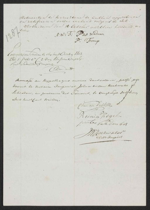 stitueerden te verrichtene te zullen approberen en ratificeren onder verband volgens de wet. Rotterdam den 16 October achttien honderd den tien. A: W: F: Pas weduwe P: Tromp Enregistré a Schiedam le dix huit Octobre 1813 fo 165 d.o ƒ 2 reçes Unfrans Ougt Six Vol 1 Cente Subvention Compris. Jan dieff annexé au Hypotheque enonce dans celle-ci, passé pour devant le notaire Empezial Jozua willem hoekwater qu' Schiedam, en præsecise des Témoins, le vingt Sept Octobre Mil huit Cent treizen C. van der Valkz. Reinier Kegel pieter van den bos J:V: Boekwater Nots. Impere.