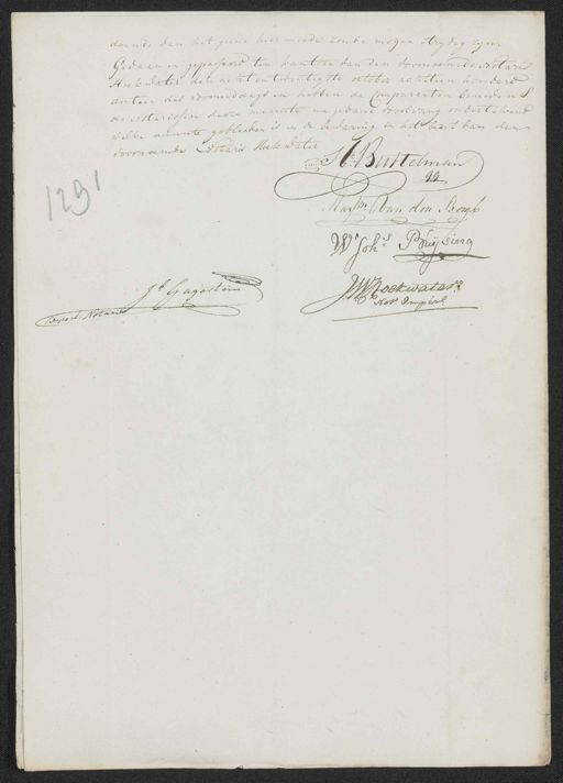 doende dan het geene hier meede zoude mogen strydig zyn. Gedaan en gepasseerd ten kantore van den voornoemde Notaris Hoekwater den acht en twintigste october achttien honderd dertien des voormiddags en hebben de Comparanten benevens de Notarissen deeze minute na gedane voorlezing ondertekend welke minute gebleeden is in de bewaring en het bezit dan den voornoemde Notaris Hoekwater Hr. Buttelman qq Maijm van den Berge W Johs. Buijsing verte J: V: Roekwater Jb. Gagestein Nots. Impet. Keyserl: Notaris