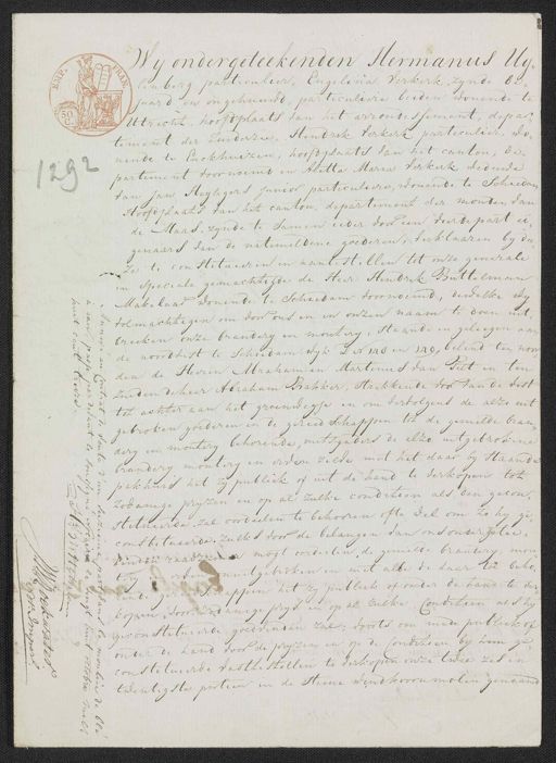 Wy ondergeteekenden Hermanus Uij¬ lenberg particulier, Engelina Verkerk, zynde be„ jaard en ongehuurd, particuliere beiden wonende te Utrecht, hoofdplaats van het arrondissement, depar„ tement der zuiderzie, Hendrik Verkerk particulier, wo„ nende te Enckhuizen, hoofdplaats van het canton, de„ partement voornoemd en Aletta Maria Verkerk weduwe 92 van Jan Heijlegers Junior particuliere, wonende te Schiedam Hoofdplaats van het canton, departement der monden van de Maas, zynde te samen ieder voor een vierde part ei„ genaars van de natemeldene goederen, verklaaren by dee ze te constitueeren en aantestellen tot onze generale en speciale gemachtigde de Heer Hendrik Buttelman Makelaar wonende te Schiedam voornoemd, dewelke wy volmachtigen om door ons en in onzen naam te doen uit„ breeken onze brandery en monterij, staande en geleegen aan de noordvest te schiedam, wyk D N 148 en 149, belend ten noor„ den de Heeren Abraham en Martinus van Pelt en ten zuiden de heer Abraham Bakker, strekkende vos van de vest tot achter aan het groenwegje en om vervolgens de alzo uit 522 gebroken goederen en de gereedschappen tot de gemelde bran„ [afbeeld] derij en montery behorende, mitsgaders de alzo uitgebrokene brandery montery en erven zelve met het daar by staande pakhuis het zy publiek of uit de hand te verkopen tot zodanige pryzen en op al zulke conditien als den gecon„ stitueerde zal oordeelen te behooren ofte wel om zo hy ge constitueerde, zulks voor de belangen van ons ondergetee„ kenden raadzamer mogt oordeelen, de gemelde brandery, mou tern en erden onuitgebroken en met alle de daar toe beho„ rende gereedschappen het zy publiek of onder de land te ver„ kopen door zodanige prys en op al zulke Conditien als hy d geconstitueerde goedvinden zal; voorts om mede publiek of onder de hand voor de pryzen en op de Conditien by hem ge constitueerde vast te stellen te verkopen onze twee zes en twintigste portien in de steene windkoornmolen genaamd