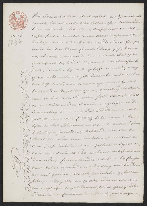 Voor Jozua Willem Hoekwater en zijnen ambt genoot, beiden keizerlijke notarissen, residerende binnen de stad schiedam, hoofdplaats van het vijfde Canton van het tweede Arrondissement van No. 86 het departement der Monden van de Maas, Compa 1296 reerde de Heer Pieter Cornelis Dieprycx, koorn¬ wijnbrander, woonende binnen deeze stad op de Gooistraat wijk E. N. 15., aan ons Notarissen be kend, dewelke bij deeze op heft de inschrijving op den acht en twintigste december achttien hon E derd Elf ten zijnen naame genomen bij het bureau der Rijpotheecquen, gevestigd te Rotter dam in het derde Register folio 35 verso N. 31. op een huis en Erve, staande en gelegen in de zwaansteeg binnen de stad schiedam, van ouds op N. 25, tans wijk C. N.o 43 belend aan de Eenen 32 zijde de stad schiedam en aan de andere zijde dirk koper Janszoon, strekkende voor van de straat tot achter aan denzelve, welk huis en Erve heeft toebehoord aan Catharina Egers we¬ duwe van Hendrik Poo, en tans toebehoord aan David Poo; Consenterende mitsdien hij Compa rant dat de gemelde inschrijving word beschouwd als niet gedaan, als ook, dat dezelve op het voor schreven Register en op alle anderen waar in die mogt zijn ingeschreven, worde geroijeerd, zullende den conservateur der Hijpothecoquen