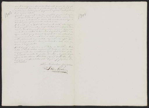 son et heritage une somme de trois cent tragte six francs (cent soixante florins) la quelle somme le comparant den„ dens declare advis recue du Comparant acquerens dont quitance sans aucune reserde? 303 Cèdant le Comparant vendeur au profit du Comparant acque„ 1304 rens ses heritiers ou ayant cause de tout droot action et re„ clame que le vendeur a en sur la dite maison et heritage le cout sons promesse de garantie suivant la coi. C'est ainsi que le tout a été conde un et arrété entre les par„ ties qui pour l'execution des presentes font élection de domi„ ciles en leurs demeures susdesignées; auxquels lieux ils consenten la validité de tous actes et exproits de justice rela„ tifs ce contrat que y seraient signifiés et ce non obstant tous changemens de demeures dans la suite; promettant d'exe„ cuter fidelement les presentes, obligeant à cet effet tous leurs biens presens et à venir, renoncant à toute chose con„ traire a ces presentes. Tract et passé à Schiedam en l'étude du dit Notaire Hoek„ water le trente octobre milhuit cent treize au soir et ont les Comparants avec les Notaires signé après lecture faite la presente minute la quelle est restée en la garde et pos„ session du dit Notaire Hoekwater (signé) David Zoo ^ P. Die prycx, Jn Hoekwater Not Imper:l, Jb Gegestem kei„ zerl. Notaris Pour traduition Conforme J: van Alphen. E