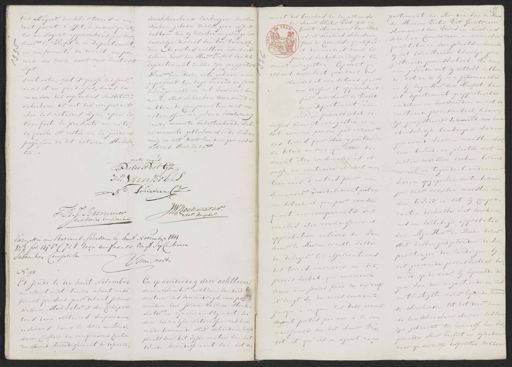 tes at'égard des dites terres n'au¬ voorschreevene landeryen zullen worden gedaan zullen geen effect ront point d'effet, a moins qu'el hebben ten zij dezelven ingevolge het les ne soyent approuvées pas mon keizerlijk decreet van den twaalf¬ siens le Prefit de ce Departement den Augustus achttien honderd en conformité du decret impa¬ zeden door den Heer Prefeit van dit nal du douze aout mil huit cent Departement zullen zyn geapprobeerd Sept Waar van deeze acte gedaan en Dont acte; fait et passe les sons gepasseerd ten dage maand en jare mois et an que dessus, dans la bodengemeld in het weeshuis bin¬ maison des orphelins susdite à nen de stad Schiedam voornoemd en Schiedam et ont les comparants hebben de Comparanten met de notarissen na gedane voorleze avec les notaires signe apres lec¬ ture faite la presente minute deeze minute onderteekend, wel¬ ke minute gebleeven is in de bewa¬ la quelle est restée en la garde et ring en het bezit van den gemelde possesoon du dit notaire. Hoeuwe¬ Notaris Hoekwater ter mots raijes Pieter Post GZ H: Van Robes No. Schieveen CZ Joekwater. F: B: J: Bremmer J:W:H Nots. Imparl. notaire imperiae Enregistré au Bureau de Schadam le huit Novembre 1813 vol 2 fol: 145 r:o C: 7 & 8. reçu un francs vingt Six Centimes Subvention Comprise Van Deerts No. 95 En op donderdag den achttien¬ Et jeudi le dix huit Novembre den November achttien honderd michuit cent treize avant midi dertien des voormiddags, compa„ turent presens par devant Jozua reerden voor Jozua Willem Hoek¬ Willem Hoekwater et son Collegue water en zijnen ambtgenoot, bei¬ tous deux Notaires Imperianie den keizerlijke Notarissen residee¬ re sidans dans la ville de Schie¬ rende binnen de stad schiedam hoofd¬ dam Chefleen du cinquieme Canton plaats van het vyfde canton dan het du Second Arrondissement du depaste¬ tweede Arrondissement van het de partement der Monden van de Maas ment des bouches de la Meuse les sieurs Pieter Post fils de de Heeren Pieter Post Gerritszoon ERAN Gerrit Hermanus van Bol¬ Hermanus van Boles en Nicolaas es et Nicolaas Schiedeen schiedeen Corneliszoon, in derzelver fils de Cornelis, qualifiés qualiteiten en woonplaatsen vermeld et domiciliés dans le by het bovenstaande behoorlyk gere¬ proces verbal ce-dessus dû¬ gestreerde procesverbaal; Te ken¬ ment enregistre; Exposant qu nen gevende dat zy ontdekt hebben ils ont decondert que dans les de, dat in de bij hun geformeerde clanses et conditions par en bij myn Heer den Prefect van eux dressees et approuvées dit Departement geapprobeerde par monsieur le Trifèt conditien en voorwaarden in het va de ce Departement en ons renstaande procesverbaal, behoor¬ cees au proces verbal ci- lyk geregistreerd vermeld door hun dessus, dûment enregistre, il e„ toit nomme par eux par erreur abusivelijk landerijen waren des terres pour être y paître genoemd welken moesten woo¬ du betail au lieu qu elles de¬ den beweid, in plaatse dat de vorent être ensemenices et zelven moesten worden bezaard aussi au contraire il doit men en ook in tegendeel anderen waren opgegeeven om te bezaai tionnees d'autres pour en¬ jen daar dezelven moesten wor¬ se mences oùvou devroient pâêtre den beweid en dat zy Compa¬ du betail et que par conse, ranten derhalve met voorken¬ quent eux comparants ont nis en volledige approbatie conclus avec connaissance et van Myn Heer de Maire dezes probation entiere de Mon¬ stad hadden goedgevonden de ver¬ sieur le Maire de cette ville pachtingen der landeryen by de de laijer les adjudications het genoemde proces verbaal der des terres enoncees au dit meld op de daar by bepaalde dat proces verbal, qui auroient gen van den negentiende en zes lieux aux jours fixés du dix neuf en twintigste dezes lopende maand et vingt su du mois courant te surcheren, tot dat door hun jusqu'a ce que les dits erreurs de voorschreevene abuizen zullen soyont portés par eux à la con¬ zijn gebracht ter kennisse van wel¬ naissance du dit Sieur Tre¬ gemelde Heer Prefect en zylieden tit et qu'ils en ayent recu¬ daar op deszelfs dispositie zullen