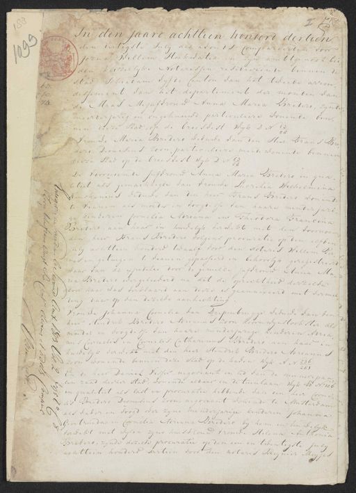 10 I D In den jaare achttien honderd dertien den dertigste July des avonds Compareerden voor Jozua Willem Hoekwater en zyn ambtgenoot bei„ den keizerlijke Notarissen resideerende binnen de stad Schiedam vyfde Canton van het tweede arron¬ 63. dissement van het departement der monden van 10. 74. de Maas Mejufvrouw Anna Maria Bredero, zijnde meerderjarig en ongehuuwd particuliere wonende bin¬ nen deeze stad, op de broesvest Wyk D N 63 58 Vrouwe Maria Bredero weduwe van den Heer Frans Bre„ dero Deonesius zoon particuliere meede wonende binnen deeze stad op de broesvest wijk D N 63 58 De voornoemde Jufvrouw Anna Maria Bredero in qua„ liteit als gemachtigde van vrouwe Lucretia Wilhelmina Kenckenius weduwe van den heer Frans Bredero wonende te Vianen als moeder en doogdesse van haare minderjari„ ge kinderen Cornelia Adriana en Theodora Francina Bredero aan haar in huwelyk verwekt met den voornoem¬ den heer Frans Bredero volgens procuratie op den elfden July achttien honderd twaalf voor den Notaris Willem Per„ nes en getuigen te dianen gepasseerd en behoorlyk geregistreerd waar van de expeditie door de gemelde Jufvrouw Anna Ma¬ ria Bredero overgeleeverd na dat de oprechtheid derzelve door haar was verklaard aan deeze is geannexeerd met vermel ding daar op van dezelve aanhechting vrouwe Johanna Cornelia van Diepenbrugge weduwe dan den heer Hendrik Bredero Adrianus zoon koornwynstookster als moeder en voogdesse van haare minderjarige kinderen Adria nus Cornelis en Cornelis Catharinus Bredero aan haar in huwelijk verwekt met den heer Hendrik Bredero Adrianus zoon wonende binnen deze stad op de haven Wyk A N 236 281 En de heer Daniel Visser negociant en ad van de municipaa een raad deezer stad, wonende aldaar in de tuinlaan Wyk B No. 106 in qualiteit als last en procuratie hebbende van den heer Corne lis Bredero Dromsius zoon, negociant wonende te Amsterdam als vader en voogd over zyne minderjarige kinderen Johanna Geertruida en Cornelia Adriana Bredero bij hem in huwelyk verwekt met wylen zijne huisvrouw vrouwe Helena Anthonia Bredero, zynde dezelve procuratie op den een en twintigste July achttien honderd dertien door den notaris Reynier Meyjes