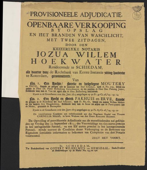 Provisioneele adjudicatie OPENBAERE VERKOOPING BY OPSLAG EN HET BRANDEN VAN WASCHLICHT, MENT TWEE ZITDAGEN, DOOR DEN KEITERLYKE NOTARIS IO ZUA Willem H O E K W ATER Resideerende te SCHIEDAM, als daartoe door de Rechtbank van Eerste Instantie zitting houdende te Rotterdam, gecommitteerd / Van No. I. Een Hechte, Sterke en welgelegene MOUTERY en ERVE, staande en gelegen aan de westvest der Stad Schiedam, wyk A. No. 209, belend ten zuiden de Heer Dr. Pieter Brillenburg Gerarduszoon en ten noorden de heer Isaac Penning Junior, strekkende voor van de Vest tot agter aan de Heer Brillenburg voornoemd. Zynde in de Grondlasten over den Jaare 1813 aangeslagen op 50 Fr. 40 Ct. of ƒ 23. 19. 14. No. 2. Een Hecht en Sterk PAKHUIS en E RVE, staande en gelegen in de Boterstraat der Stad Schiedam, wyk D. No. 67, belend ten oosten Willem Melkert en ten westen Arij Maagdenberg, strekkende voor van de Straat tot achter aan de participanten van de Molen, genaamd de Buonaparte. Zynde in de Grondlasten over den Jaare 1813 aangeslagen op 30 Fr. 83 Ct. of ƒ 14-13-10 De voorschrevene Goederen zyn toebehoorende aan den Nagelaten Boedel van Vrouwe CORNELIA MAAS, in leven Weduwe van den HeereADRIANUS BREDERO. De Opveiling of provisioneele Adjudicatie aan de meestbiedenden zal geschie¬ den op Vrydag den 10 September 1813, des Voormiddags ten tien uuren praecies in het eerstgemelde Perceel, en ten Elf uuren praecies in het laatstgenoemde Perceel; zynde ontrent de Conditien dezer Verkooping en de Bewyzen van Eigendom inmiddels informatien te bekomen ten Comptoire van den Notaris voornoemd. ZEGT HET VOORT. HIEDAM, WILHELMUS van HEMSDAAL, Stads-Drukker Ter Boekdrukkerij van GoVERT en Boekverkoper op de Markt No. 143 en 146.