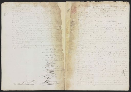 ten voornoemde Notaris Hoekwater en zijn ambt sloten en behoorlyk geregistreerd als gemachtigde zo representeerende de heer Jan Arkema Negorrant wo te Amsterdam, als toeziende voogd over de boven derjarigen Johanna Geertruida en Cornelia Adriana Br= zynde de gemelde toeziende voogden tot dezelde door een nomen posten verkozen te weeten: De Heer Brichenburg bij besluit van den familieraad gehouden voor den van het Canton Schiedam blykens deszelfs proces verba den tienden April achttien honderd twaalf geregistreerd tigste derzelve maand. De Heer Visser als by besluit van melie raad gehouden voor den voornoemden Vrederechter deszelfs procesverbaal van den dertienden April achttien derd twaalf geregistreerd den twintigste derzelde maand heer Aikema als bij besluit van den familie raad gehouden den Vrederechter van het tweede canton van de Stad Amsterd blykens deszelfs procesverbaal van den vyfde Mey achttien derd twaalf geregistreerd den achtste derzelve maand; Wel voornoemde toeziende doogden verklaard hebben zich tegen de koping der voorschreeven onroerende goederen niet te verzitten maar dezelve goed tekeuren. En hebben de Comparanten benedens de voornoemde toeziende voogden en de notarissen na gedane voorlezing alhier geteekend Ter voldoening aan het voorschreeven ver¬ zoek waar van aan de Comparanten acte is verleend is door den gemelden Notaris Jozua Willem Hoek¬ water dadelyk in tegenwoordigheid van zynen gemel„ den ambtgenoot en volgens de opgave en begeerte van alle de Partyen overgegaan tot het opmaken van de na„ volgende. Conditien en voorwaarden volgens welken aan de meestbiedende of laatste verho„ gers zullen worden toegeweezen de natemeldene onroeren„ de goederen waar van de verkoop by opdeiling bedolen is by tonnis van de rechtbank van eerster instantie zitting houden„ de te Rotterdam van dato den vyfden october achttien hon„ derd twaalf, geregistreerd den zevende derzelve maand, als: N.o 1 Een monterij en erve staande en geleegen binnen de stad schiedam aan de westdest wijk A No 209 belend ten zuiden een gang, welke gemeen is tussen deeze montery en de heer D.r Pieter Brillenburg Gerardus zoon en ten noorden de heer Isaac Pen„ ning Junior, strekkende voor van de vest tot achter aan de Heer Brillenburg voornoemd. erde is begroot op een somma De voorschreeven monter van twaalf dinzend zes honderd francs / zes duizend Guldens / N.o 2 Een pakhuis en erve staande en geleegen binnen de stad schiedam in de boterstraat Wyk D No 67 belend ten oosten Wil„ lem Melkert en ten westen Arij Maagdenburg, strekkende voor van de straat tot achter aan de participanten van de molen genaamd de Buonaparte. A=a M=a Breders wed. frans Bredero DZ Ao. Ma. Breders qq J:C: Van Diepenbrugge Wed. H. Bredero Asz Daniel vissch qq Huydecoper J.Dmllenburg Daniel Vissers als toezend Voogd Willem Weth Junr. te Jb. Gageszoon Hoeckwater Keizerl. Nots. W:C: Keijzerl. Notaris Het voorschreeden Pakhuis en erde is begroot op een somma dan acht honderd en veertig francs (dier hondert guldens) De beiden gemelde begrotingen blyken by het rapport door de Heer Willem ’t Hart meester timmerman te Schiedam als door de rechtbank voornoemd by vonnis van den zevende september achttien honderd twaalf geregistreerd den negende derzelde maand, benoemd tot expert deswegens voor den voornoem„ den Notaris Hoekwater die daar van de minute heeft en deszelfs ambtgenoot gepasseerd den tweeden october deszelven jaars be„ hoorlijk geregistreerd. De voorschreeden goederen behoren tot de nalatenschap van dron de Cornelia Maas en leeden weduwe van den Heer Adrianus bredero, dan wien erfgenamen onder beneficie van inventaris