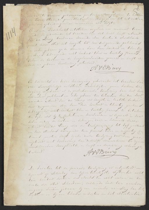 aldaar te samen gekomene personen voorgeleezen te hebben de voorenstaande procesverbaalen, overgegaan tot het ontvan„ gen der opbiedingen en manieren als volgt: Er is een waschlicht ontstoken ongeveer een minuut Oran„ dende en gedurende het branden van dat licht heeft Arend van der Burg bouwman wonende den buiten de overschreve poort dezer Stad het hoogste bod door het gemelde pakhuis en erve gedaan op de somma van vier honderd en twintig guldens bedragende acht honderd twee en tachtig francs, boden de lasten in de koopvoorwaarden gemeld en heeft al hier na gedane voorleezing geteekend. A V.D.Burch En dermits na deeze derhooging gedurende het branden van drie successivelyk ontstoken waschligten geene verdere der„ hoging is gedaan is de provisioneele toewijzing dan het voor„ schreeden pakhuis en erve gedaan ten behoeden van den voor„ noemden Arend van der Burg als hoogste en laatste bieder voor de gemelde som dan vier honderd en twintig guldens bedragende acht honderd twee en tachtig francs, te betalen ten tijde als by de Conditien en voorwaarden is bepaald en daar boven onder de lasten en bedingen daar in vermeld welke Arend van der Burg alzo de trekpenning tot vyf guldens en vier stuivers bedragende tien francs twee en negentig Cen times genoten heeft, zynde deeze toewyzing door hem geac„ cepteerd met verkiezing van deszelfs domicilium ter zyner voorschreeven woonplaatse, en heeft na voorlezing alhier ge teekend. A vd Burg De vacatie tot de finaale toewyzing is uitgesteld en bepaald op Saturdag den vyf en twintigste September acht tien honderd dertien des avonds ten acht uuren in den doele der Stad Schiedam; zullende hier van aankon de ging worden gedaan by een nieuwe aanslag van bi„ lietten en bij een tweede insertie in het advertentie