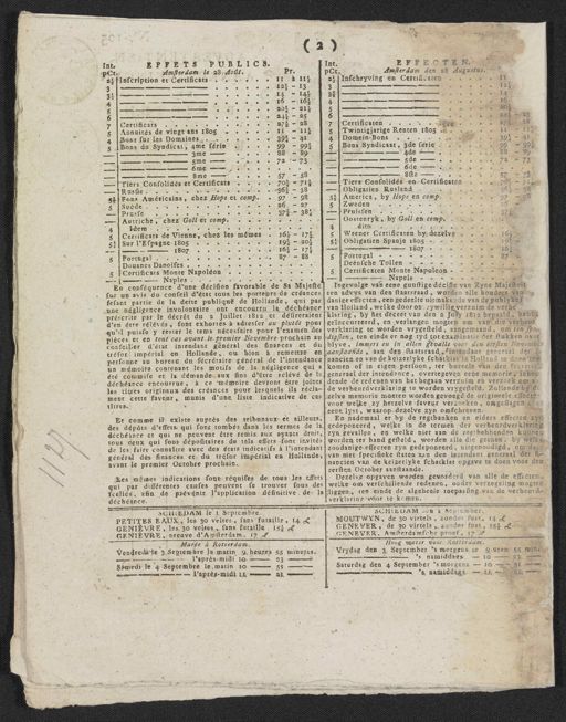 ( 2 ) E F F E C T E N EFFETS P U B L I C S. Amsterdam den 28 Augustus. Amsterdam le 28 Août. Inschryving en Certificaten II à II½ 1/3 Inscription et Certificats.. 12½ - 13 . 14 - 14 16 - 16½ 20¾ - 21½ - 2½ - 25 27½ - 28 Certificaten .. Certificats Twintigjarige Renten 1805 - 21 II - 11½ . Annuités de vingt ans 1805. Domein-Bons 39¾ - 41 Bons sur les Domaines Bons Syndicaat, 3de serie 99 - 99¼ Bons du Syndicat, 4me série 4de 88 - 89 3 me 5de 5me - 72 - 73 6de : 6 me . 8ste 57 - 58 — 8 me Tiers Consolidés en Certificaten 70¾ - 71½ Tiers Confolioés et Certificats.. Obligatien Rusland . 36¾ - 38 . Rustie. America, by Hope en comp- 97 - 98 Fons Américains, chez Hope et comp. Zweden 26 - 27 . Suède. Pruissen.. 1 37¾ - 38¼ Prusse. Oostenryk, by Goll en comp. Autriche, chez Goll et comp. en .. dito. Idem. Weener Certificaten by dezelve 16½ - 17¼ Certificats de Vienne, chez les mêmes Obligatien Spanje 1805 - 19¾ - 20¼ Sur l'Espagne 1805 1807 - .. -. 16¾ — 17 1807 Portugal - - . .. -. 87 - 88 Portugal. Deensche Tollen ..... Douanes Danoises. Certificaten Monte Napolcon Certificats Monte Napoléon — Napels - - — Nagles „ Ingevolge van eene gunstige décisie van Zyne Majesteit En conséquence d'une dévision favorable de Sa Majesté een advys van den staatsraad, worden alle houders van De sur un avis du conseil d'état tous les porteurs de créances danige effecten, een gedeelte uitmakende van de publyke sesant partie de la dette publique de Hollande, qui par van Holland, welke door onvywillig verzuim de verbe- une négligence involontaire ont encourru la déchéance préscrite par le décrét du 2 Juillet 1812 et désireraient klaring, by het deceet van den 2 July 1812 bepaald, hebbe geïnccurreerd, en verlangen mogten om van die verbeur d'en être rélévés, sont exhortés à adresser au plutôt pour verklaring te worden vrygesteld, aangemaand, om ten spo- qu'il puisse y rester le tems nécessaire pour l'examen de pièces et en tout cas avant le premier Novembre prochain au bdigsten, ten einde er nog tyd tot examinatie der stukken over blyve, immers en in allen gevalle voor den eersten November conseiller d'état intendant général desificances et du tréfor impérial en Hollande, ou bien à remettre en paanstaande, aan den staatsraad, l'intendant generaal der personne au bureau du fécrétaire général de l'intendance (nancien en van de keizerlyke schatkist in Holland te doen toe komen of in eigen persoon, ter bureaue van den secretaris un mémoire contenant les motifs de la négligence qui a été commise et la demande aux sins d'être rélévé de la généraal der intendance, overtegeven eene memorie, inhoud dende de redenen van het begaan verzuim en verzoek om van déchéance encourrue, à ce mémoire devront être jointa de verbeurdverklaring te worden vrygesteld. Zullende by de les tîtres originaux des créances pour lesquels ils récla- ment cette faveur, munis d'une liste iudicative de ces zelve memorie moeten worden gevoegd de origineele effecte voor welke zy hetzelve faveur verzoeken, ons geslagen door titres. eene lyst, waarop dezelve zyn omschreven. En nademaal er by de regtbanken en elders effecten zyn Et comme il existe auprès des tribunaux et ailleurs des dépôts d'effets qui font bombés dans les termes de la gedeponeerd, welke in de termen der verbeurdverklaring zyn gevallen, en welke niet aan de regthebbenden kunnen déchéance et qui ne peuvent être remis aux ayants droit worden ter hand gesteld, worden alle die geenen, by welke tous ceux qui sont dépositaires de tels effets sont invité de les faire connaître avec des états indicatifs à l'Intendant zoodanige effecten zyn gedeponeerd, uitgenoodigd, om daar van met specifieke staten aan den intendant generaal der fi- général des sinances et du trésor impérial en Hollande nancien van de keizerlyke schatkist opgave te doen voor den avant le premier Octobre prochain. eersten October aanstaande. Dezelve opgaven worden gevorderd van alle de effecten Les mêmes instructions sont réquises de tous les effets welke om verschillende redenen, onder verzegeling mogten qui par différentes causes peuvent se trouver sous de scellés, afin de prévénir l'explication définitive de la liggèn, ten einde de algeheeie toepassing van de verbeurd- verklaring voor te komen. déchéance. SCHIEDAM den 1 September. SCHIEDAM le 1 Septembre MOUTVWYN, de 30 virtels, zonder fust, 14 & PETITES EAUX, les 30 veltes, sans futaille, 14 & GENEVER, de 30 virtels, zonder fust, 15½ GENIEVRE, les 30 veltes, sans futaille 15½ d' GENEVER. Amsterdamsche proef. 17 GENIËVRE, preuve d'Amsterdam. 17 A Hoog water voor Rotterdam. Marée à Rotterdam. Vrydag den 3. September's morgens te 9 uren 55 min. Vendredi le 3 Septembre le matin 9 heures 55 minures. 's namiddags — 10 l'après-midi 10 Saturdag den 4 September's morgens — 10 - - 51 Samedi le 4 Septembre le matin 10 's namiddags -11 — 24 — — 21 — l'après-midi II -