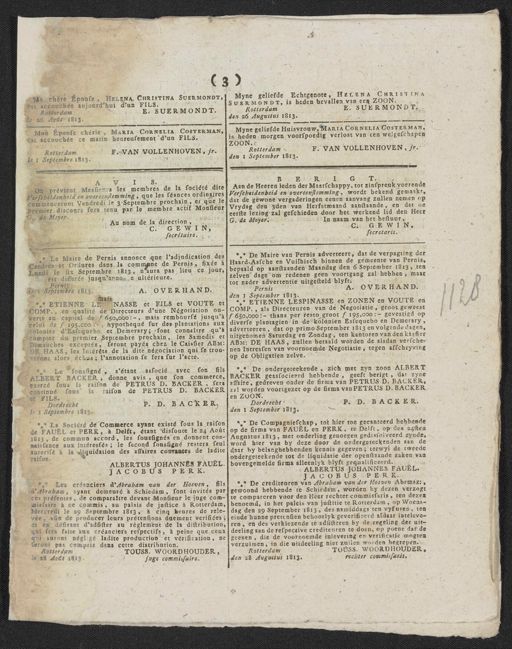 ( 3 ) Myne geliefde Echtgenote, HELENAconsistina Ma chère Épouse, HELENA, Christina Suerwondt, SUERMONDT, is heden bevallen van een ZOON accouchée aujourd'hui d'un FILS. E. SUERMONDT. Rotterdam. E. SUERMONDT. Rotterdam den 26 Augustus 1813. Le 26 Août 1813. Myne geliefde Huisvrouw, MARIA CORNELIA COSTERMAN, Mon Épouse chérie, MARIA CORNELIA COSTERMAN, is heden morgen voorspoedig verlost van een welgeschapen et accouchée ce matin heureusement d'un FILS. ZOON. F. VAN VOLLENHOVEN, jr. Rotterdam F. VAN VOLLENHOVEN, jr. Rotterdam den I September 1813. Le 1 Septembre 1813. Aan de Heeren leden der Maatschappy, tot zinspreuk voerende On prévient Messieurs les membres de la société dite Verscheidenheid en overeenstemming, wordt bekend gemaakt, Verscheidenheid en overeenstemming, que les séances ordinaires commenceront Vendredi le 3 Septembre prochain, et que lesdat de gewone vergaderingen eenen aanvang zullen nemen op Vrydag den 3den van Herfstmaand aanstaande, en dat de premier discours sera tenu par le membre actif Monsieur eerste lezing zal geschieden door het werkend lid den Heer de Meyer. In naam van het bestuur, G. de Meyer. Au nom de la direction, C. GEWIN, G E W I N, secretaris. secrétaire. * De Maire van Pernis adverteert, dat de verpagting der Le Maire de Pernis annonce que l'adjudication des Cendres et Ordures dans la commune de Pernis, fixée à I Haard-Assche en Vuilnisch binnen de gemeente van Pennis, bepaald op aanstaanden Maandag den 6 September 1813, ten Lundi le six Septembre 1813, n'aura pas lieu ce jour, zelven dage om redenen geen voortgang zal hebben, maar est differée jusqu'annonge ultérieure. tot nader advertentie uitgesteld blyft. Perni A. OVERHAND. Pernis A. OVERHAND. Septembre 1813. den 1 September 1813. * ETIENNE LESPINASSE en ZONEN en VOUTE en ETIENNE LE NASSE et FILS et VOUTE et COMP., als Directeuren van de Negotiatie, groot geweest COMP., en qualité de Directeurs d'une Négotiation ou- f 650,000:- thans per resto groot ƒ 195,000:— gevestigd op verte au capital de ƒ 650,000:-, mais remboursé jusqu'à celui de ƒ 195.000:-, hypothequé sur des plantations aux diverse plantagien in de kolonien Essequebo en Demerary, colonies d'Essequebo et Demerary; sont connaître qu'à sadverteeren, dat op primo September 1813 en volgende dagen, uitgenomen Saturdag en Zondag, ten kantoren van den kassier compter du premier Septembre prochain, les Samedis et ABM: DE HAAS, zullen betaald worden de alsdan versche- Dimanches exceptés, seront payés chez le Caissier ABM nen Intressen van voornoemde Negotiatie, tegen afschryving DE HAAS, les Intérêts de la dite négociation qui se trou op de Obligatien zelve. veront alors échus; l'anrotation se fera sur l'acte. * De ondergeteekende, zich met zyn zoon ALBERT Le soussigné, s'étant associé avec son fils ALBERT Backer, donne avis, que son commerce, [BACMER geassocieerd hebbende, geeft berigt, dat zyne exercé sous la raison de PETRUS D. BACKEN, sera affaire, gedreven onder de firma van PETRES D. Backer, zal worden voortgezet op de firma van PETRUS D. BACKEN continué sous la raison de PETRUS D. BACKEN en ZOON. et FILS. P. D. BACKEN. Dordrecht P. D. BACKEN. Dordrecht den 1 September 1813. Ie 1 Septembre 1813 * De Compagnieschap, tot hier toe gecanteerd hebbende La Société de Fommerce ayant existé sous la raison de FAUËL et PERK, à Delft, étant dissoute le 24 Août op de firma van FAUEL en PerK, te Delft, op den 24sten Augustus 1813, met onderling genoegen gedissolveerd zynde, 1813, de commun accord, les soussignés en donnent con- naissance aux intéressés; le second soussigné restera seul word hier van by deze door de ondergeteekenden aan de autorisé à la Liquidation des affaires courantes de ladite daar by belanghebbenden kennis gegeven, terwyl de tweede ondergeteekende tot de liquidatie der openstaande zaken van raison. ALBERTUS JOHANNES FAUEL. bovengemelde firma alleenlyk blyft gequalificeerd. ALBERTUS JOHANNES FAUËL. JACOBUS PERK JACOBUS PERK. De crediteuren van Abraham van der Hoeven Abrinsz:, Les créanciers d'Abraham van der Hoeven, fils d'Abraham, ayant demeuré à Schiedam, sont invités par gewoond hebbende te Schiedum, worden by dezen verzogt te compareren voor den Heer rechter commissaris, ten dezen ces présentes, de comparaître devant Monsieur le juge com- benoemd, in het paleis van justitie te Rotterdam, op Woens- missaire à ce commis, au palais de justice à Rotterdam, dag den 29 September 1813, des namiddags ten vyf uren, ten Mercredi le 29 Septembre 1813, à cinq heures de rele- einde hunne pretensien behoorlyk geverifieerd aldaar inteleve- vée, afin de producer leurs prétensions duement verifiées; ren, en des verkiezende te adsisteren by de regeling der uit- et en désirant d'adsister au règlement de la distribution. deeling aan de respective crediteuren te doen, op poene dat de qui sera faite aux créanciers respectifs, à peine que ceux qui auront négligé ladite production et vérification, ne sgeenen, die de voornoemde inlevering en verificatie mogten verzuimen, in die uitdeeling niet zullen worden begrepen. seront pas compris dans cette distribution. TOUSS. WOORDHOUDER. Rotterdam Rotterdam TOUSS. WOORDHOUDER, rechter commissaris. den 28 Augustus 1813. 26 28 Août 1813. juge commissaire.