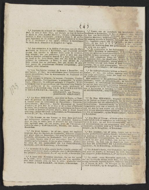 ( 4 ) " Jngement du tribunal de commerce, séant à Rotter- * Vonnis van de rechtbank van koophandel, zitting dam, en date 31 Août 1813, qui déclare en état de faillite houdende te Rotterdam, in dato 31 Augustus 1813; betwelk, la masse de Jean Baptiste Martinot, libraire à Rotterdam in staat van faillissement verklaard den boedel van Jean surféoit à fixer l'ouverture, nomme le Sieur C. M. de Vry Baptiste Martinot, boekverkooper, te Rotterdam, reserveert juge suppléant de ce tribunal juge commissaire et le Sieur de opening daarvan te bepalen, benoemd den Heer C. M. de J. G. T. Broekmeyer J. Gz. agent, ordonne la surveissance Vry, suppleant-regter van de regtbank, tot regter commis- du failli en sa demeure à la diligence de l'agent. saris, en den Heer J. G. T. Broekmeyer J. 62., tot agent beveelt de bewaking van den gefailleerden in zyn huis aan de zorg van den agent. * Les créanciers à la faillite d'Adrianus van der Hart De crediteuren in het faillissement van Adrianus van marchand en ferreries à Rotterdam, qui n'auraient point der Hart, koopman in yzerwaaren, te Rotterdan, die van encore fait vérifier et affirmer leurs titres de créances. latig zyn gebleven hunne pretensien te verifiëren en affirmeren sont avertis, par ces présentes, qu'il y aura une nou- worden by deze verwittigd, dat er nogmaals en voor de laatste velle et dernière essemblée Samedi le 4 Aoùt 1813, à midi, keer eene comparitie plaats zal hebben op Saturdag den au local le St. Joris Doele, dans une des salle du susdit 14 Augustus 1813, ten twaalf uren, in eene der zalen van de tribunal de commerce, y séant, et sont invités de s' rechtbank van koophandel, zitting houdende in den Doelen faire trouver soit en personne, soit par fondés de pou- en worden verzogt zich aldaar te laten bevinden, het zy in voir munis de procuration duement enrégistrées, pour persoon, het zy door gemagtigden, voorzien van behoor van remplir cette formalité. geregistreerde volmagten, om deze formaliteit te vervul- * Les soussignées viennent de former à Bruxelles, rue * De ondergeteekenden hebben te Brussel, in de rue aus aux Laines, n°. 894, un établissement pour l'éducation des Laires, no 894. een institut opgerigt voor de opvoeding jeunes démoiselles, sous la dénomination de Pensionnat des van jonge jufvrouwen, onder den naam van Pensionnant van dames Gernaert. de jufvrouwen Gernaert. On y enseigne la réligion, la lecture, l’écriture, l'ortho- Men onderwyst er den godsdienst, het lezen, schryven, de graphe raisonnée, l'arithmétique, la géographie, la mytho- spelkunst, reken- en aardrykskunde, de fabelleer, de ge- logie, l'histoire, les différens ouvrages à l'aiguille, et gé- schiedenis, de verschillende naaldwerken en in het alge- néralement tout ce qui constitue une éducation bien soignée al wat tot eene verzorgde opvoeding behoort. Le prosperus et les conditions dudit pensionnat se Het prospectus en de voorwaarden van hetzelve pensionnage trouvent à Rotterdam chez VAN WESTERKAPPEI zyn te Rotterdam te bekomen by VAN WESTERKAPPEL et GROENENDYK, libraires, rue Haute. en GROENENDYK, boekverkoopers, op de Hoogstraat. GERNAERT, née TRESCA, GENNAERT, geb. TRESCA. JOSEPHINE GERNAERT. JOSEPHINE GERNAERT. * Le Sieur HERVIEUX, marchand de Paris, a l'hon- * De Heer HERVIEUX, koopman van Parys, heeft de neur de prevenir les Messieurs et Dames, qu'il continuera /eer de Heeren en Dames te berigten, dat hy continuëert met à vendre avec un affortiment de Porcelaines, Verreries het verkoopen van een affortiment Porceleinen, Glaswerken, Quincalleries, Merceries, fausses Bijouteries et Jouets Quincallerien, Galanteriewaren en Kinderspelen, tot den d'enfans, an prix sixe de 10 sous et de 15 sous d'Hollande vastgestelden prys van 10 stuivers en 15 Stuivers hollandsch, la pièce. On y trouvera également un assortiment de Fayence ook zal men by hem vinden een affortiment Créels Aarde- de créelle et quantité d'autres oljets, dont le détail serait / werk en eene meenigte andere goederen, te veel om te melden, troplong, jusque Mercredi 15 Septembre, au Westnieuwland tot den 15 September, op het Westnieuwland, wyk D, n.o 85, fection D, n.o 85, à Rotterdam. te Rotterdam. seltig * Un Homme ou une Femme où bien deux personnes * Een Man of Vrouw, of beide echte lieden zynde, ge- qui desireroient s’engager chez des personnes honnêtes, negen zynde zich te engageren by ordentelyke lieden, in- of avec ou sans la table, pour la demeure sur une campagne buiten de kost, op een stille buitenwoning, met het gezigt très agréable avec un bel jardin, près de l'Oostpoort; l of divertissement van een aangenamen tuin, even buiten de s'adresser chez J. VAN BAALEN, libraire, rue haute, Oostpoort, adressere zich by J. VAN B AALEN, boekver- Rotterdam. kooper, op de Hoogstraat, te Rotterdam. Un jeune homme, de 26 ans, ayant été employé * Een Jongman, van 26 jaren, langen tyd in Handel- longtems dans des Maisons de Commence, désirerait trouver huizen geëmployeerd geweest zynde, wenschte een plaats op une place chez un Négociant, soit pour la correspondance een Kantoor te vinden, het zy voor de Fransche, Duitsche Francaise, Allemande, ou Hollandaise, soit pour la tenue of Hollandsche Correspondentie, het houden der Boeken, des Livres, service dont il est très-aufait, tant en parties hetwelk by zeer goed verstaat, zoo wel het Italiaansch als doubles qu'à l'ordinaire: Il fait de plus l'Anglais. S'adres- het gewone. Hy kent ook de Engelsche Taal. Adres bij ser chez M. DE LUSSANET DE LA SABLONIERE den Heer DE LISSANET DE LA SABLONIERE, op het Spuiwater, près du Krattebrug, à Rotterdam. Spuiwater, by de Krattebrug, te Rotterdam. * A vendre de la main, quatre bassins à huile, couvert en Uit de hand te koop, vier Olybakken, met lood bekleed, plomb, tout comme neufs; s'adresser chez J. MAERSMAN. zoo goed als nieuw; te bevragen by JOH: MAARSTAN, mre plombier, rue Houttuin, L, n.o 217 et 218, à Rotterdam mr. loodgieter, in den Houttui