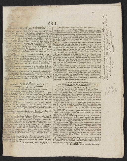 ( 5 ) OPENBERE VERKOOPING By OPSLAG, Nte publique, aux ENCHËRES, al sijfdaas met twee zitdagen. en deux séances. De keizerlyke notaris JoZUA WILLEM HOEKWATER, ### notaire impérial JOZUA WILLEM HOEKWATER residerende binnen de stad Schiedam, vyfde canton, tweede dant dans la ville de Schiedam, cinquième canton uxième arrondissement du département des Bouches de l’arrondissement van het departement der Monden van de Maas, als daartoe door de rechtbank van eerste instantie, zitting Meuse, à ce commis par le tribunal de première in- houdende te Rotterdam, gecommitteerd, zal, in het openbaar ance, séant à Rotterdam, vendra en public, aux en by opslag, met twee zitdagen, verkoopen de navolgende es, en deux séances, les immeubles suivans, savoir goederen, als: Une Multerie forte, solide et bien située en No. 1. Een hegte, sterke en welgelegene Moutery en Erve, dances, située au westvest de la ville de Schiedam staande aan de westvest der stad Schiedam, wyk A, n.o 209. 100 A, no. 209, tenant sud à Monsieur le docteur belend ten zuiden den Heer dr. Pieter Brillenburg Gerarduszoon Brillenburg, fils de Gerard, et nord à Monsieur Isaac unior, s'étendant de devant du vest jusque der-Ien ten noorden den Heer Isaac Penning junior, strekkende voor van de Vest tot agter aan den Heer Brillenburg voornt:) Monsieur Brillenburg susnommé; taxée à la contri- zynde in de grondlasten, over den jare 1813, aangeslagen op on foncière pour cette année 1813 à 50 francs 40 cent: 50 fr. 40 cent. of ƒ 23:19:14. 3:19:14. No. 2. Een hegt en sterk Pakhuis en Erve, staande in de 2. Un Magasin fort, solide et Dépendances, situé au Boterstraat, binnen de stad Schiedam, wyk D, n.o 67, belend bierstraat, dans la ville de Schiedam, section D, n.o 67 ten oosten Willem Melkert, en ten westen Arij Maagdenberg, est à Willem Melkert et ouest à Ary Maagdenberg x strekkende voor van de straat tot agter aan de participanten tendant de devant de la rue jusque derrière aux participant van de Molen, genaamd de Buonaparte; zynde over dezen moulin, nommé de Buonaparte; taxé à la contributior jare 1813 in de grondlasten aangeslagen op 30 fr. 83 cent. rière pour cette année 1813 à 30 francs 83 centimes, ou of ƒ 14 : 13 : 10. 13:10. De voorschrevene goederen behooren tot de nalatenschap dits immeubles appartiennent à la succession de Dame ### Maas, de son vivant veuve de Monsieur Adrianus van Vrouwe Cornelia Maas, in leven weduwe van den Heer Adrianus Bredero. adjucation provisoire se fera le Vendredi 10 Septembre De provisioneele adjudicatie zal geschieden op Vrydag den 10 September 1813, des voormiddags ten tien uren precies, à dix heures du matin précises dans le premier et in het eerstgemelde, en, ten elf uren precies, in het laatst- leures précises dans le second lot. On peut s'adresser genoemde perceel; zynde omtrent de conditien der verkooping, avoir des informations à l'égard des conditions de la et des Utres de propriété en l'étude du notaire sus- en de bewyzen van eigendom informatien te bekomen, ten Comptoire van den voornoemden notaris. tatē CHD KH.E In naam van Zyne Majesteit De par Sa Majesté DEN KEITER EN KONING EN DE JUSTITIE. L'EMPEREUR ET ROI ET LA JUSTICE. IER EN KONING EN DE ter rolle der gerechtelyke uitwinningen by de vierschaar à l'audience des expropriations forcées du tribunal van eersten aanleg, zitting houdende te Rotterdam, de première instance, séant à Rotterdam. No. 1. Van een Huis en Erve, zynde geschikt tot verscheide N° 1. D'une Maison et Terrains appropriée pour plu- ders habitations, sise à l'est du vieux port à Delfts- woningen, staande en gelegen aan de oostzyde van de Oude- haven, te Delftshaven, wyk B, n.o 52, belend ten zuiden en, section B, n.o 52, tenant au sud le Nieuwstraat de Nieuwstraat en ten noorden Jan van Nierop en Andries au nord Jan van Nierop et Andries van der Hoeven geodant de par devant du vieux jusque par derrière van der Hoeven, strekkende voor van de Oude- tot achter- aan de Nieuwehaven. nouveau port. N.o 2. Een Huis en Erve, staande en gelegen als voren, N.o 2. Une Maison et Terrains, sise comme dessus diction B, n.o 60, renant au sud le Sieur Adrien van lwyk B, no. 60, belend ten zuiden den Heer Aariaan van Ommering en ten noorden Willem van Ling, strekkende voor enmering et au nord Willem van Ling, aboutissant de par- van de straat tot achter aan de huizinge van den Heer vant de la rue jusque par derrière à la maison du Sieur van Ommering. van Emmering. Gearresteerd als onroerend goed ten lasten van de weduwe Saisies immeubilièrement sur la veuve Leendert van Hamont, Leendert van Hamont, wonende aan de westzyde van de demeurant à l'ouest du vieux port à Delftshaven. Oudehaven, te Delftshaven. Ter requisitie van den Heer Johannes Wichers, kalkbrander, A la réquéte du Sieur Johannes Wichers, fabricant de aux, demeurant à Oudshoorn, ayant fait élection de wonende te Oudshoorn, domicilium kiezende ten kantore ruicile en l'étude de son avoué P. Commys, demeurant] van zynen avoné Pieter Comrys, wonende in den Oppert, wyk F, no. 161 en 154, te Rotterdam. — Oppert, section E, n.o 161 et 154, à Rotterdam. By proces-verbaal, gedagteekend dertien Augustus agttien- Par procès-Verbal, en date du treize Août mil-huit ent-treize, enrégistré le seize suivant par le receveur honderd-dertien, geregistreerd den zestienden daaraanvolgende door den ontvanger Poan Marlemont, overgeschreven ten van Marlemont, transcrit au bureau des hypotheques bureele der hypotheken te Rotterdam den agttienden en ter Rotterdam, le dix-huit et au greffe du susdit tribunal le griffie van bovengemelde vierschaar den zeven en-twintigsten vingt-sept du même mois, dont copie a été remis au Sieur Cottaar, gressier an juge de paix, du deuxième canton derzelve maand, waarvan afschrift is gelaten aan den Heer Delft, et an Sieur Willem van Ling, adjoint maire de Cottaar, griffier by het vredegerecht van het tweede canton Delft, en aan den Heer Willem van