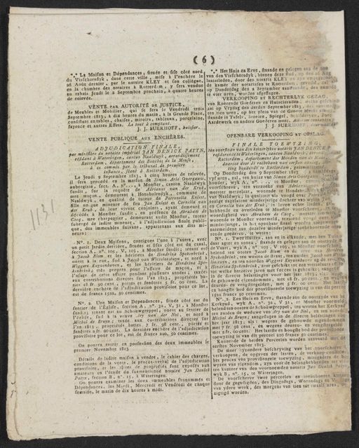 ( 6 ) * Het Huis en Erve, staande en gelegen aan de Roo * La Maison et Dépendances, située et sise côté nordé van den Visschersdyk, binnen deze stad, op den 26 Aug. du Visschersdyk, dans cette ville, mise à l'enchère le laatstleden, door den notaris KLEY en zyn amptgenoot de kamer der notarissen te Rotterdam, geveild, zal als 26 Août dernier, par le notaire KLEY et son collègue. en la chambre des notaires à Rotterdam, y sera vendue op Donderdag den 2 September aanstaande, des namidd. au rabais Jeudi le 2 Septembre prochain, à quatre heures te vier uren, worden afgeslagen. oob VERKoopine bij Rechterlijk gezag, de relevée. van Roerende Goederen en Huiscieraden, welke geschied VENTE PAR AUTORITÉ DE JUSTICE, de Meubles et Mobilier, qui se fera le Vendredi trois zal op Vrydag den derden September 1813, des voormid### ten tien uren, op het plein van de Groote Markt alhier, Septembre 1813, à dix heures du matin, à la Grande place staande in Tafels, Stoelen, Spiegel, Schilderyen, Porc consitant en tables, chaises, miroirs, tableaux, porcelaine, Aardewerk en andere Goederen meer. Alles om contanten fayence et autres Effets. Le tout à comptant. J. J. DUERHOFF deurwaarder J. J. SUERHOFF, huissier. OPENBERE VERKOOPING by OPSLAG. VENTE DUBLIQUE AUX ENCHËRES. Finale Toewezing ADJUDICATION FINALE, ten overstaan van den keizerlyken notaris JAN DENICK Pr Par ministère du notaire impérial JAN DENICK PATYN, residerende te Wateringen, canton Naaldwyk, arrondissement residant à Wateringen, canton Naaldwyk, arrondissement Rotterdam, departement der Monden van de Maas, Rotterdam, département des Bouches de la Meuse, daartoe door de rechtbank van eersten aanleg, zit- à ce commis par le tribunal de première ting houdende te Rotterdam, gecommitteerd, lnstance, séant à Rotterdam. Op Donderdag den 9 September 1813's namiddags Le Jeudi 9 Septembre 1813, à cinq heures de relevée vyf uren, zal, ten huize van Simon Arie Overgauw, logen il sera procedé en la maison de Simon Arie Overgauw, houder, wyk A, n.o.. te Monster, canton Naaldwe aubergiste, sect. A, no.., à Monster, canton Naaldwyk voorschreve, ten verzoeke van Adrianus van de meest meester metzelaar, wonende te Hondsholledykgen susdit, sur la requête de Adrianus van der Kruk, mre maçon, demeurant à Honsholredyk, commune de van Naaldwyk, in qualiteit als voogd over Petroilla Kr. Naaldwyk, en qualité de tuteur de Petronella Kniest fille un que mineure de feu Jan Kniest et Cornelia van eenige nagelatene minderjarige dochter van wylen Jan der Kruk, de leur vivant conjoints, ayant demeuré et en Cornelia van der Kruk, in leven echte lieden, ge- décédés à Monster susdit, en présence de Abraham de hebbende en overleden te Momster voorschreve, in te Cocq, mre charpontier, demeurant audit Monster, tuteur woordigheid van Abraham de Cocq, meester timmer- wonende te Monster voormeld, toeziend voogd over voor subrogé de ladite mineure, à l'adjudication finale publi- minderjarige, in het openbaar finaal worden toegewezen que, des immeubles fuivans, appartenans aux dits mi- na temeldene aan dezelve minderjarige toebehoorende onro H.J. Mad. rende goederen, te weten: Deurs : N.o 1. Twee Huizen, aan en in elkande, met een Tuin N.o I. Deux Maisons, contigues l'une à l'autre, avec daar agter en annex, staande en gelegen aan de oostzyde un petit Jardin derrière, situées et sises côté est du canal fection A, n.o 105, V, 103, à Monster susdit; tenant est de Vaart, wyk A, no 105, U 103, te Monster voorschre- belend ten oosten Jacob Blom en de erve van Hendrik à Jacob Blom et les héritiers de Hendrina Spekenbrink ouest à la rue, sud à Jacob van Witteloostuyn, et nord à Spekenbrink, ten westen de straat, ten zuiden Jacob van Wiste Wiggert Kuyvenhoven, et les héritiers de Hendrina Spe- loostuyn, en ten noorden Wiggert Kuysenboden en de erve Vos, Hendrina Spekenbrink, zeer geschikt tot een metzelaars afft te kenbrink; très propres pour l'affaire de maçon, et a tot welke hetzelve jaren met succes is gebruikt; aangest l'usage de cette affaire pendant plusieurs années; taxées aux contributions directes sur l'an 1813, propriétés ba- in de directe belastingen voor het jaar 1813; als: wege ties 18 fr. 90 cent, portes et fenêtres 5 fr. 00 cent. La de gebouwde eigendommen, met 18 fr: 90 cent., en wegens deuren- en vengstergelden, met 5 fr. 00 cent. Het laatste dernière enchère de l'adjudication provisoire pour ce lot en hoogste bod der provisioneele toewyzing is van dit perceel est de francs 1522, 50 centimes. 1522 francs 50 centimes. No. 2. Een Huis en Erve, staande aan de oostzyde van het N.o 2. Une Maison et Dépendances, située côté est du sentier de l'Église, section A, n.o 32, V, 31, à Monster Kerkpad, wyk A, no. 32, U 31, te Monster voormeld susdit; tenant est au Schouwgreppel; onest au sentier de belend ten oosten de Schouugreppel, ten westen het Kerkpad ten zuiden de weduwe van Ary van der Nol, en ten noorde l'église, sud à la veuve Ary van der Nol, et nord à Michel de Bruyn; aangeslagen in de directe belastingen voor Michel de Bruyn; taxée aux contributions directes sur l'an 1813, propriétés baties 7 fr. 98 cent., portes et het jaar 1813, als: wegens de gebouwde eigendommen fenêtres 2 fr. oocent. La dernière enchère de l'adjudication ¶ met 7 fr. 98 cent., en wegens deuren- en vengstergelde met 2 fr. oo cent. Het laatste en hoogste bod der provisionee provisoire pour ce lot, est de francs 220, 50 centimes. toewyzing is van dit perceel 220 francs 50 centimes. Kunnende de beiden Perceelen worden aanvaard met de On pourra entrer en possession des deux immeubles lu eersten November 1813. De meer byzondere beschryving van het voorschreve premier Novembre 1813 verkoopene, de opgaven der lasten, de verkoop-conditien Détails de ladite maison à vendre, le cahier des charges, het proces van provisioneele toewyzing, mitsgaders de be- conditions de la vente, le procès- verbal de l'adjudication provisoire, et les tèrres de