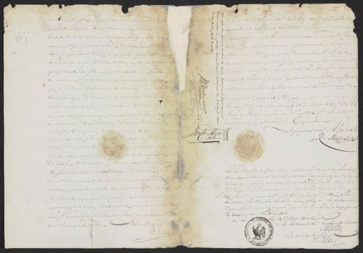 twintigsten Maart achttienhonderd twee overleden zijnde te Schadam voornoemd; in w boedel de voornoemde minderjarigen als mede 567 namen zijn geïnteresseerd; ten dien einde om hem Comparant in zijne gemelde qualiteit dat de noodige requisitoiren te doen en de acte dasweg gelijk meede de Memorie van lasten en Veilcondi te teekenen of passeeren; de vereischte af gen te laten effectueeren, de voorlopige en twee toewijzingen te doen, en de daartoe benood acten en processen verbaal te teekenen ren, de kooppenningen meede te helpen dat en daarvoor te quitteeren, is 't nood tot 't een of ande in regten te ageeren, ten dien einde te compagieeren voor alle Regtbanken en vrede geregten, zich als daar trachten te bemeestigen of anderszints der zaak door regterlijke gewijsde te termineeren, de Vonnissen te vervolgen, tot de executie inclusive Hijpothecaire inschrijvingen te neemen, in 't roij ment daarvan te consenteeren, domicilium te kiezen; en voorts alles te doen en verrigten waartoe hij Heer Comparant ingevolge de Wet verplicht is, en noodig zal zijn; Schoon ook eene ampeler vol magt noodig ware die de Heer Comparant houdt voor hier geinsereerd. — Alles met magt van Subst. Substitutie onder belofte van approbatie en verband volgens de Wet. 2/2 ƒ 5 Gepasseerd in Amsterdam voornoemd, ten kan tore van den eerst ondergeteekende Notaris Reinier Meijjes, op de binnenkant No. 25. den een en twintigsten Julij achttienhonderd dertig En is de minute deezes door den Heer Comparant en ons Notarissen na gedane voorlezing, geteekend welke minute is gebleeven onder de bewaring van gemelde Notaris Meijjes. Enregre. a Amsterdam le 21 Juillet 1813. fo. 85. R.o Care 9. Reçu in franc vingt six C=es 10e et 16 ces compris. (:geteekend:) Gagneraux Uitgegeven voor Afschrift Jan Mr. Meijer Notaris R. Meijes Not Le Tribunal de premiere instance seant a Amster dam, departement du Zuijderzee, certifie que les signa tures ci-dessus sont celles des Notaires R. Meijjes et J.C. Meijer, à Amsterdam, et que foi doit y être ajoi tée tant en jugement que En foi de quoi nous vresi„ dent du Fribunal susdit, avonssigné la presente l'avons fait contresigner par le Greffier et apposer le sceau de Tribuna. Amsterdam le 21 Juillet 1800 tresze Le President du Fribunal susdit Schreven 1. De par le Tribunal (2) Hr. Helde Vijftier EITDERV.