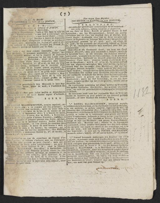 ( 7 ) Van wegen Zyne Majesteit De par Sa Majesté DEN KEITER EN KONING EN DER JUSTITIE. Z'EMPEREUR ET ROI ET LA JUSTICE. VEITER EN KONING EN DER JUS E, ter rolle der gerechtelyke uitwinningen by de rechtbank audience des criées au tribunal de première van eerste instantie, zitting houdende te Rotterdam, lnstance, seant à Rotterdam, van een Huis en Erve, staande en gelegen binnen de stad et Dépendances, située et sise dans la ville de m, Westnieuwland, eenant sud à Christiaan van Rotterdam, aan het Westnieuwland, belend ten zuiden Christiaan van der Loo, ten noorden Sara de Koning, wed. nord Sara de Koning, veuve Gerrit Boeser, s'éten- devant de la rue jusque dertrière à Daniel de Superville Gerrit Boeser, strekkende voor van de straat tot agter aan ohanna Maria Boon, enrégistrée ci-devant au prothocol Daniel de Superville en Johanna Maria Boon; ten prothocolle n° 4516, 4517, maintenant sur le seul n°. 4516 et dé- geregistreerd geweest op n.o 4516. 4517, nu alleen op no. 4516, en ten quohiere der verponding bekend op littera ée au cadastre de l'imposition foncière par section D D, n.o 82, wordende hetzelve huis bewoond door den ge- 82, laquelle maison est habitée par 'le faisi. arresteerden. Gearresteerd als Onroerend Goed, ten laste van Carel Dont faisie a été faite comme immeuble, sur Carel uard Michaeli, te nommant maintenant C. Blondel, de- Eduard Michaëlt, thans zich noemende C. Biendel, wonende brant en ladite maison, et sur la requête de Johannes in herzelfde huis, en ten verzoeke van Johannes Roedolf, particulier, wonende in de Jan van Loons laan, in de gemeente dolff, particulier, demeurant au Jan van Loons, laan van Rotterdam, hebbende tot deszelfs praktizyn Sebastiaan La commune de Rotterdam, ayant pour practicier iaan Theodorus Voorn Boers, demeurant dans ladite Theodorus Voorn Baers, wonende binnen voornoemde stad, aan de Hoogstraat, wyk K, n.o 26 en 28, by procesverbaal rue Haute, section K, n.o 26 et 28, en date du ving van den negen-en-twintigsten Mey 1800 derrien, geëntegi- Mai 1800 treize, enrégistré par le receveur Poan streerd door den ontvanger Poan Marlemont, den een-en- riemant le trente et un suivant contre payement des dertigsten daaraan volgende, tegen betaling der verschul- pranscrit au bureau des hypotheques à Rotterdam digde rechten, overgeschreven op het bureau der hypotheken mier Juin du même an et au greffe dudit tribunal te Rotterdam den eersten Juny deszelfden jaars en ter griffie Juin suivant, dont copies ont été laissées à Mon en Carolus Jacobus Blankenheim, maire de la ville de van voormelde rechtbank den derden Juny daaraan volgende Monsieur Brons, commis greffier de la tterdam et stice de paix, deuxième canton de la même ville. adjudication provisoire se fera Mercredi le huit Sep- derzelfde stad. tembre 1800 treize, heure de midi, à l'audience des des dudit tribunal. Le faisissant a offert pour ladite maison et dépendances rechtbank. l'amise à prix à un mille florins argent d'hollande, deux mille cent francs. waarvan copie is gelaten aan Mynheer Carolus Jacobus Blankenheim, maire der stad Rotterdam, en aan den Heer Brons, commis-griffier van het vrede-gerecht, tweede canton De voorloopige toewyzing zal plaats hebben op Woensdag den agtsten September 1800 dertien, des middags ten twaalf uren, ter rolle der gerechtelyke uitwinningen by voornoemde De executant heeft voor het voormelde Huis en Erve ge- boden en hetzelve op prys gesteld tot een duizend guldens hollands, of twee duizend een honderd francs. BOERS. BOERS. DANIEL ELLINCKHUYSEN, keizerlyk notaris, DANIEL ELLINCKHUYSEN, notaire impérial, ré- lant à Rotterdam, à ce commis par son principal, se l'residerende te Rotterdan, als last hebbende van zyn principaal. propose de mettre aux enchères, après en avoir faite la is van meening, na gedane aangifte, ingevolge de wet, op Maandag den 13 September 1813,'s morgens ten 9 uren, in de declaration en conformité de la loi, et de vendre en pu blic, Lundi le 13 Septembre 1813, à 9 heures du matin, Raampoort, even buiten de Delftschepoort der stad Rotterdam, publyk te veilen en te verkoopen: eene groote zeer fraaye an Raampoort, hors la porte dite de Delft, à Rotterdam party Vrugtboomen, bestaande in fraaye hooge vrugtdragende une grande et belle partie d'Arbres Fruitiers, consistant en Peeren en Appelen, Lei Appelën en Peeren, Pruimen enz., oiriers, pommiers et pruniers portant tous fruits, pêchers hooge en lage Lei-Persikken, ook groote Paauwenstaarten- notiers, tous de la meilleure espèce; lesdits arbres se Persikken enz., Morellen enz.; staande in de Raampoort ouvent au Raampoort, où l'on pourra les examiner deux mors avant la vente, le matin de neuf heures à midi et voornoemd, alwaar dezelve twee dagen voor den verkoopdag,- apres midi de trois à six heures; les amateurs, qui le des morgens van negen tot twaalf en des namiddags van drie tot zes uren, ook van stonden aan, voor de liefhebbers, défirent, pourront les voir dés aujourd'hui, chez PiETER des begerende, te zien zyn by PIETER VERWAAYEN, VERWAAYEN, y demeurant section Q, n.o 26 ancien, e wonende aldaar, wyk Q, no. 26 oud en wyk R, n.o 13 nieuw. fection R, n.o 13 nouveau. * Iemand kunnende aanbrengen een Rapitaal van circa- * Quelqu'un en état de contribuer un Capital d'en- ƒ 35,000, en genegen zynde zich te associëren in eene Fahryk, viron ƒ 35000, et désirant s'associer avec un Fabriquant qui de sou côté possède un petit Capital, mais qui au met een persoon, die ook een klein Kapitaaltje kan fourneren, doch overigens geen genoegzaam fonds heeft, gelieve zich te esté, manque de fonds assez considérables, est prié de adresser par lettre suscrite P. N., chez le libraire-ladresseren onder de letters P.N., by den kantoor-boekver- kooper I. ELLERMAN, in de Beurssteeg, te Amsterdam. apetier I. ELLERMAN, Beurssteeg, à Amsterdam. La De persoon, in kwestie, heeft alle mooglyke en noodige kunde ertonne qui fait cette demande possède toutes le