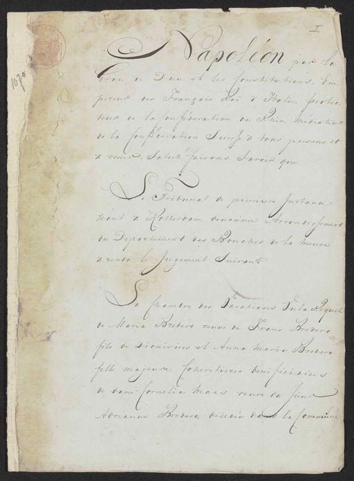 I Napoléon par la Grau de Dieu et les Constitutions, Em¬ pereur des François Roi d'Italie, protect teur de la Confédération du Rhin, Mediateur de la Confédération Suisse à tous presens et à venir, Salut, faisons savoir que. „ Iribunal de premiers Instance séant a Rotterdam, deuxieme Arrondissement du Departement des Bouches de la Meuse a rendu le Jugement Suivant La Chambre des Vacations Vula Requete de Maria Bredero verve de Frans Bredero fils de Dionisius et Anna Maria Bredero fille majeure Coheritieres benificiaires de dame Cornelia Maas veuve du Sieur Adrianus Bredero, de ceder dans la Commune