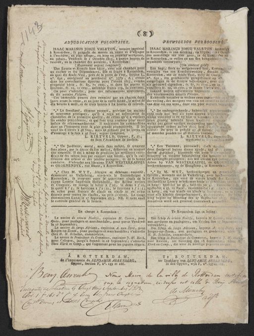 8 V R T W I L L IGE VERROOPING ADJUDICATION Daerontaare ISAAC MARINUS JOSUÉ VALETON keizerlyk ISAAC MARINUS JOSUÉ VALETON, notaire impérial à Rotterdam, se propose de mettre en vente et d'adjuger lte Rotteram, is van meening, op Vrydag den 1 Octob. à l'enchère, au plus offrant, ou bien au premier acceptant, des namiddags ten vier uren, in de kame der no- au tabais, Vendredi le 1 Octobre 1813, à quatre heures de té Rotterdam, te veilen en aan den hoogstbieden den mynenden toetewyzen relevée, en la chambre des notaires, à Rotterdam: (Om contant geld) (Moyennant argent comptant) Une Écurie et Remise bien bâtie, avec une chambre pour Een hegt, sterk en welgebouwd Stal, Koetsna voorzien van een Koetsierswoning, staande en un cocher et ses Dépendances, sise et située à Rotterdam au quai dit Stads-Vest, près de la porte de l'est, section L, Rotterdam, aan de Stadsvest, na by de Oostp. n°. 692, enrégistré au prothocol n°. 3379, A ; cottée n.o 692, ten prothocolle geregistreerd op n-o dans les contributions directes pour l'année 1813, comme jaangeslagen in de directe belastingen, over den propriété bâtie, fr. 82, 71 cent., et dans les portes et als gebouwd eigendom, fr. 87,71 cent., en in fenêtres, fr. 22, 10 cent., ensemble francs 109, 81 centimes vengsters fr. 22, 10 cent.; te samen francs 100, lemand nadere informatien begerende, adressen On peut s'adresser, pour des informations ultérieures, den voornoemden notaris Valeton. au dit notaire Valeton. Cet immeuble pourra être examiné par un chacun deux Kunnende hetzelve te veilene twee dagen voor en op jours avant La vente, et au jour de la vente même, le matin de der veiling, des morgens van rien tot twaalf en deenentig dix heures a midi, et de trois heures à six heures de relevée, van drie tot zes uren, door een yder worden bezigtigd. * Le soussigné, dûment patenté, prévient ses anciens * De ondergeteekende, behoorlyk gepatenteerde et nouveaux pratiques, qu'il a reçu un affortiment de l'zyne oude zoo wel als zyne nieuwe begunstigers chandelles de la première qualité, de celles qu'il a vendues weder voorzien is en by hem te bekomen zyn de les années précédentes, et qui sont trop connues pour avoir jaren genoeg bekende beste kwaliteit Gegoten besoin de récommandations. Il exécutera les commisstons j welke dus geene verdere aanbeveling noodig heeft dont on l'honorera avec la plus grande promptitude. Il les Hoptegevene orders zullen door hem ### vend les 6 livres à 48 sous, mais en prenant par 60 livres ou voerd: De prys is gesteld op 48 stuiver. per steen d'avantage à la fois à 46 sous, argent comptant. of meerder ponden tot 46 stuivers contant. L. RIETUELD, Oppert, F L. R I E T V E L D, Oppert, F, 51 1 en face l'Académie de dessein. tegen over de Teeken-Academie * Un Jardinier, marié, mais sans enfans, se trouvant * Een Tuinman, getrouwd, doch zonder sans place, par le décès de son maistre, désireroit en trouver door sterfgeval buiten dienst zynde, zag zijn gaarne une nouvelle. Il est à même de produire les meilleurs certi-derom geplaatst, kunnende van zyne bekwaamheid ficats de ses talens tant par rapport aux serres, qu'à la cul- broeyery en verdere behandeling van boorten en moet tivation des arbres et des jardins potagers, et de sa bonne de volledigste getuigenis, zoo wel als van zyn gedrag, ge- conduite. S'adresser aux libraires VAN WESTERKAPPEL Adres by VAN VESTERKAPPerL en GROENE et GROENENDYK, rue Haute, à Rotterdam. boekverkoopers, op de Hoogstraat, te Rotterdam. Chez M. W Y T, libraire et débitant autorisé, * By M. WYT, boekverkooper en geauthoriseerd demeurant au Valkebrug, vis-à-vis le Boerensteiger à Isplitser, wonende aan de Valke brug, over het Boerenstelijk Rotterdam, se trouvent pour la quatrième classe de la fte Rotterdam, zyn voor de vierde klasse der Keizerlijk 11 9me Loterie Impériale Hollandaise, des Billets entiers Hollandsche Lotery te bekomen heele en gedeeliens van logen et Coupons, en louage le billet à f 20, le demi à ƒ10, in huur: heel-lot 20 gl., half-lot 10 gl., kwart-lot gelt Ie quart à ƒ 5, le huitième à f 2 : 10, le seizièmé à f 1 : 5 agtste-lot 2 gl. 10 stuiv., zestiende-lot 1 gl. 5 stiiv.; alsmede en achat pour fournir de classe en classe et en achat in koop, om van klasse tot klase te fourneren, en in Koop sournis pour toutes les classes, au prix-courant. Le tirage voor alle klassen doorgefourneerd, prys-courant. De tres commencera Lundi le 27 Septembre 1813. NB. II tient aussi king begint op Maandag den 27 September 1819. NB le controle-général de la loterie. denzelven word ook generaal contraboek gehouden. Te Rotterdam ligt in lading: En charge à Rotterdam: Le navire de vrouw Neeltje, capitaine M. Goeree, pour Het schip de vrouw Neeltje, kaptein M. Goeree, naar Gues Goes, pour passagers et marchandises, pour partir Vendredi met goederen en passagiers, om Vrydag den 17 September de Ie 17 Septembre; vertrekken; Le navire de jonge Adriaan, capitaine A. van Dort, pour Het schip de jonge Adriaan, kaptein A. van Dort, met Bergen-op-Zoom, pour passagers et marchandises; s'adresser Bergen-opZoom, met passagiers en goederen; adres chez H. H. Schuller, commissaire. H. H. Schuller, commissaris. Le navire le Protesteur de Commerce, capitaine J. W. Hack Het schip le protecteur de Commerce, kaptein J. W. Hack pour Colonne, jusqu'à Samedi le 18 Septembre; s'adresser naar Keulen, tot Saturdag den 18 September; adres bij chez Klerk et Comp., qui soigneront pour les papiers réquis. klerk en Comp., die voor de noodige papieren zorgen. A ROTTERDAM Te ROTTERDAM, de l'Imprimerie de BENJAMIN ARRENBERG, ter Drukkery van BENJAMIN ARRENDERG, Oppert, section F, n.o 159 et 166. in den Oppert, wyk F, n.o 159 en 166. Bem. Amenke Nous Maire de la ville de Rotterdam certifio que la signature cidessus est celle de Benj. Arresse enregistre a Schiedam le Vrugt tcoir Septembre 1813. de Monchy Ool. 1. fo 161 r.o C. 7 revig Un franc Ougte ex Adjr Cent dering et das Compr