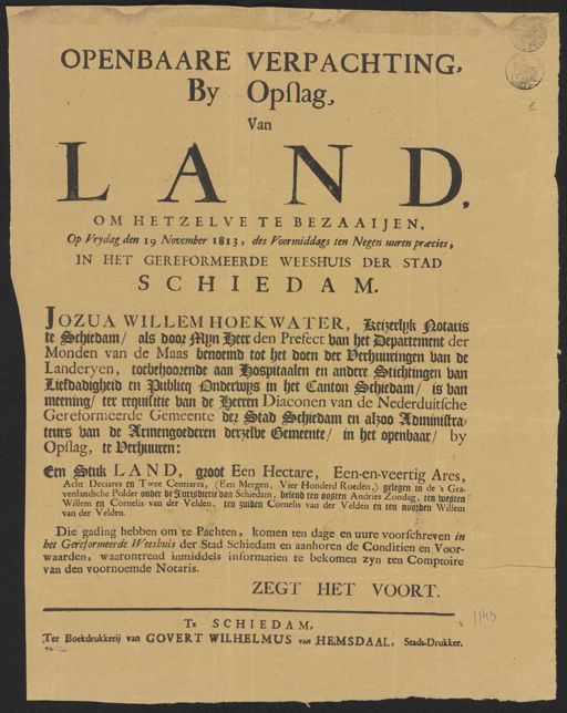 OPENBAERE VERPACHTING, Opslag, By Van 4 1 OM HETZELVE TE BEZAAIJEN. Op Vrydag den 19 November 1813, des Voormiddags ten Negen uuren praecies, IN HET GEREFORMEERDE WEESHUIS DER STAD SCHIEDAM. JoZUA WILLEM HOEKWATER, Keizerlyk Notaris te Schiedam / als door Myn Heer den Prefect van het Departement der Monden van de Maas benoemd tot het doen der Verhuuringe van de Landeryen, toebehoorende aan Hospitaalen en andere Stichtingen van Liefdadigheid en Publicq Onderwys in het Canton Schiedam / is van meening/ ter requisitie van de Heeren Diaconen van de Nederduitsche Gereformeerde Gemeente der Stad Schiedam en alzoo Administra¬ teurs van de Armengoederen derzelve Gemeente / in het openbaar / by Opslag, te Verhuuren: Een Stuk LAND, groot Een Hectare, Een-en-veertig Ares, Acht Deciares en Twee Centiares, (Een Mergen, Vier Honderd Roeden,) gelegen in de's Gra¬ venlandsche Polder onder de Jurisdictie van Schiedam, belend ten oosten Andries Zondag, ten westen Willem en Cornelis van der Velden, ten zuiden Cornelis van der Velden en ten noorden Willem van der Velden. Die gading hebben om te Pachten, komen ten dage en uure voorschreven in het Gereformeerde Weesbuis der Stad Schiedam en aanhoren de Conditien en Voor- waarden, waarontrend inmiddels informatien te bekomen zyn ten Comptoire van den voornoemde Notaris. ZEGT HET VOORT. 1149 Te SCHIEDAM. Ter Boekdrukkerij van GoVERT WILHELMUS van HEIMSDAAL, Stadt Drukker.