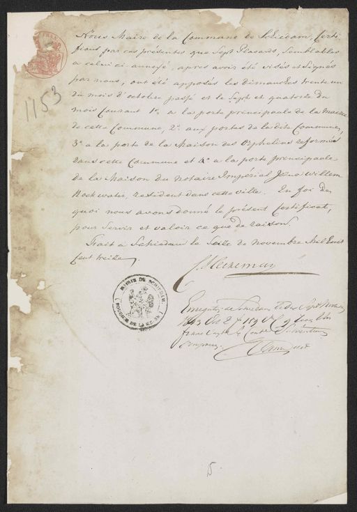 Nous Maire de la Commune de Schiedam, Certi fians par ces presentes que sept Placards, semblables a celui ci-annexé, apres avoir eté visés et signes par nous, ont été apposés les dimauches trente un du mois d'octobre passé et le sept et quatorze du mois Courant 1„o a la porte principaale de la Maczie de cette Commune, 2e aux portes de la dite Communen 3.e a la porte de la Maison des Orphelins reformés Dans cette Commune et 4.e a la porte principaale de la Maison du notaire Imperial Jozua Willem hoekwater, resident dans cette ville. En foi den quoi nous avons donné le présent Certificat, pour Servir et valoir ce que de raison. Fait a Schiedam le Seize de novembre Milhuit Cent treize S. Heereman DE Dl Enregenten als meedam leden Sept Novembre 1813 Vol 2 fo 159 d.C 9 renen Uhr. DE LAM voor frans Ouytse Sr Cente Subventaris Compte. Clemmert