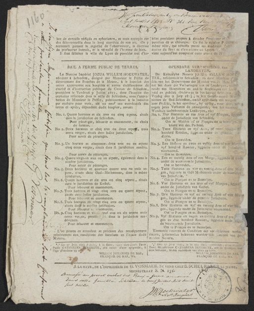 Hee pour Valoir Simbrs au Bureau de Schiedam Sept Juillet 1873. N.o 364. Eenen trenten Huysen Hebrention Compareerde D Van Dier bre de conseils rédigés en aphorismes, et tous appuyés sur l biles praticiens propres à étendre l'ancienne et des faits recoeillis dans le long exercice de son art. On y puration de sa chirurgie. Ce fut le célèbre Pouteau reconnait partout la sagacité de l'observateur, la domine même ville, qui réveilla parmi les modernes l'ont du professeur instruit, et la véracité de l'homme de bien. Gecine du feu: et c'est encore un Lyonnais, M. Il faut féliciter la ville de Lyon de posséder tant d'ha- vient aujourd'hui compléter cette oeuvre de Pr OPENBARE VERPACHTING VAN BAIL A FERME DUBLIC DE TERRES. LANDERYEN. De Keizerlyke Notaris Jozua Willem Hoek Le Notaire Impérial JOZUA WILLEM HOEKWATER, résidant à Schiedam, désigné par Monsieur le Préfet du TER, residerende te Schiedem, als door Mynheer département des Bouches de la Meuse, à la location des s sekt van het Departement der Manden van de Maas terres appartenant aux hospices et autres établissemens de tot het doen der Verhuringen van de Landeryen, toest charité et d'instruction publique du Canton de Schiedam, rende aan hospitalen en andere Stichtingen van Liefd heid en publiek Onderwys in het kanton Schiedam, procédera le Vendredi 9 Juillet 1813, dans l'hospice des Vrydag den 9 July 1813, in het Gereformeerd Wed orphelins réformés dans la ville de Schiedam, sous l'appro- bation de Monsieur le Préfer, publiquement à la location binnen de stad Schiedam, onder approbatie van welgem. heer Prefekt, in het openbaar, by opslag, voor drie, zes par enchère pour trois, six ou neuf ans consécutifs des negen jaren Verhuren de navolgende, aan het voornoe terres ci-après, dépendant dudit hospice, savoir: Weeshuis toebehoorende Landeryen, als: No. 1. Vier Hectares en zes Arès of vyf Morgen, liggende No. I. Quatre hectares et six ares ou cinq arpens, situés onder de Jurisdictie van Schiedam. dans la juridiction de Schiedam. Om te Weiden of te Ploegen en te bezaaljen, Pour pâturager, labourer et ensemencer, au choix keuze van den Pachter. du fermier. No. 2. Twee Hectares en vyf Arès, of twee Morgen de N0 2. Deux hectares et cinq ares ou deux arpens, trois honderd Roeden, liggende onder de gemelde cents verges, situés dans ladite juridiction. dictie. Pour servir de pâturages. Om te Beweiden. No. 3. Un heetare et cinquante-deux ares ou un arpent No.3. Een Heeure en twee en vyftig Ares of een Morgen vyf honderd Roeden, liggende onder de Jurisdictie cinq cents verges, situés dans la juridiction susdite. voornoemd. Pour servir de pâturages. Om te Beweiden. No. 4. Een en tachtig Ares of een Morge, liggende al mede No. 4. Quatre vingt-un ares ou un arpent, également dans la onder de voornoemde Jurisdictie. susdite juridiction. Om te beweiden. Pour servir de pâturages. No. 5. Deux hectares et quarante quatre ares ou trois ar- No.5. Twee Hectares en vier en veertig Ares of drie Mor- pens, situés dans Oud-Mathenesse, dans la même gen, liggende in Oud Mathenesse onder de voorschre- ven Jurisdictie. juridiction. Om te Ploegen en te Bezaaijen. No. 6. Quatre bectares et six ares ou cinq arpens, situés No. 6. Vier Hectares en zes Ares of vyf Morgen, liggen dans la juridiction de Kethel. onder de Jurisdictie van Kethel. Pour labourer et ensemencer. Om te Ploegen en te Bezaaijen. No. 7. Trois bectares et vingt cinq ares ou quatre arpens, No. 7. Drie Hectares en vyf en twintig Ares of vier More situés dans ladite juridiction. gen, liggende onder de gemelde Jurisdictie. Pour labourer et ensemencer. Om te Ploegen en te Bezaaijen. No. 8. Trois hectares en vingt cinq ares ou quatre arpens, No. 8. Drie Hectares en vyf en twintig Ares of vier M situés dans la susdite juridiction. gen, liggende onder de Jurisdictie voornoemd. Pour labourer et ensemencer. No. 9. Cinq hectares et vier neuf ares ou six arpens trois Om te Ploegen en te Bezaaijen. No. 9. Vyf Hectares en negen en twintig Ares of zes cents verges, pareille dit dans la juridiction sus- gen en drie honderd Roeden, liggende mede onder désignée. de voornoemde Jurisdictie. Pour labourer et ensemencer. Om te Ploegen en te Bezaaijen. Kunnende omtrent de Conditien der voorschreven verbu- L'on pourra en attendant se procurer des renselgnemens relativement aux conditions des locations en l'étude dudit ringen, informatien bekomen worden ten Kantore van ge- melden Notaris. Notaire. * Le 27 Juin 1813 d céda, à la Haye, notre bien-année Tante * Den 27 Juny 1813, is in den Haag overleden, onze waarde Dame CATHARINA BERGHEYK, des suites d'une appiexie, à Tante Mejufvrouw CattenHARING BEGHeYK aan de gevolgen van eene beroerte, in den ouderdom van circa 59 jaren. l'âge d'environ 59 aus. Willem.johannes de Bas. WILLEM JOHANNES DE BAS, François DE BAS, Wz. François de Bas, Wz. A LA HAVE, DE L'IMPRIMERIE DE G. VOSMAER. SE VENDCHEZB. SCHEUREER LE JEUNE, NEENESTRAAT S. N. 152. Annexé au procel verbal des Baux a ferme annonce dans cette feuille. Schiedam le neuf Juillet Mil huit Ceut treize. J:V: Hoekwater. Nots. Imper.