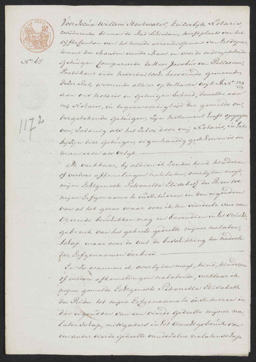Voor Jozua Willem Hoekwater, keizerlijk Notaris residerende binnen de stad schiedam, hoofdplaats van het vijfde Canton van het tweede arrondissement van Eetdepar„ tement der Mouden vande Maas en voor de ondergetekende No. 67 getuigen Compareerde de Heer Jacobus van Pellacom, Predikant in de Nederduitsche hervormde gemeente dezer stad, woonende alhier op de Haven wijk A. N.o 234 179 aan ons notaris en getuigen bekend, dewelke aan mij Notaris, in tegenwoordigheid der gemelde on¬ dergetekende getuigen, zijn testament heeft opgegee„ 2 ven, zodanig als het zelve door mij Notaris, in het bij zijn dier getuigen, eigenhandig geschreven is in manieren als volgt: Ik verklaar, bij aldien ik zonder kind, kinderen of verdere afkomelingen natelaten, overlijden mogt, mijne Echtgenoote Petronella Elisabeth du Rieu tot mijne Erfgenaame te institueren in den eigendom van al het geene waar over ik ten voordeele van een vreemde beschikken mag en bovendien in het vrucht gebruik van het geheele gedeelte mijner nalaten„ schap waar over de wet de beschikking ten nadeele der Erfgenaamen verbied. En zo wanneer ik overlijden mogt, kind, kinderen of verdere afkomelingen nalatende, verklaar ik mijne gemelde Echtgenoote Petronella Elisabeth du Rieu tot mijne Erfgenaame te institueren in den eigendom van een vierde gedeelte myner na latenschap, mitsgaders in het vruchtgebruik van een ander vierde gedeelte van dezelve nalatenschap.