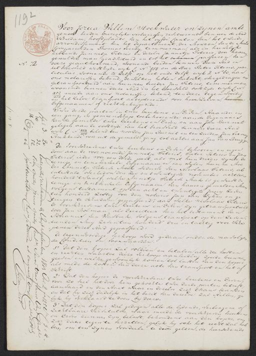 Voor Jozua Willem Hoekwater en zynen ambt genoot beiden kuzerlyke Notarissen resideerende binnen de stad schiedam, hoofdplaats van het vyfde Canton vanhet tweede arrondissement van het departement, der monden van de Maas Compareerden Thomas Verwey, timmerman, als in huwelyk hebbende Jannetje Feteris en dezelve Jannatje Peteris door haaren gemelden man geadsisteerd en tot het tekenen passeeren van deeze geauthoriseerd, woonende beiden binnen deeze stad in No. 72 het broesveld westzyde wyk ƒ N. 518 en de Heer Pieter Teteris, par ticulier, woonende te Delft op het oude delft, wyk 2 No 60, aan ons notarissen bekend, dewelken hebben verkocht, overgedragen en getransporteerd aan hunnen broeder Jan Peteris, timmerman, woonende binnen deeze Stad in het broesveld oostzyde wyk C N 462 meede aan ons notarissen bekend, ten deeze tegenwoordig 474 en het zelve transport accepterende voor hem zelven, hunne Erfgenaamen of rechtverkrijgende Twee derde parten in twee keukens en Erven, Staande in een gang, in gemeenschap toebehoorende aan de Eigenaars van de gemelde twee keukens en Erven en aan Jan Burnet gelegen aan de oostzyde van het broesveld binnen deeze stad wijk C N 454 belend ten noorden Jan Burnet en ten zuiden Jan Vermee¬ 456 strekkende voor uit de gemelde gang tot achter aan Jan van Brugge 2/30 de voorschrevene twee keukens en Erven behooren in eigen dom aan de voornoemde Jannetje Peteris, Pieter Teteris en Jan Feteris, ieder voor een derde part, als met hun drieën zynde de eenige en universeele Erfgenaamen van wylen hunne hoe der Annetje Pieterse Mak weduwe van Nicolaas Peteris, ab intestato overleden den zes en twintigste november achttien honderd twaalf, welke Annetje Pieterse Mak is geweest de x x eenige en universeele Erfgenaame van haaren gemelden Man volgens testament op den acht en twintigste Juny Zeven tien honderd zestig voor den notaris Jan van Lyken en ge¬ tuigen te schiedam gepasseerd; aan welke nicolaas Peteris de voorschrevens twee keukens en Erven zyn getransporteerd door Jan Bolman als Executeur van het testament van Adrianus van Wasbeek, volgens, transport op den Zeven¬ tienden Mey zeventien honderd drie en tachtig voor sche¬ penen dezer Stad gepasseerd: de tegenwoordige verkoop word gedaan onder de navolgen de Conditien en voorwaarden. 1.o dat den koper zal voldoen en betalen alle de kosten en rechten waartoe deeze verkoop aanleiding zoude kunnen geeven en welke gewoonlyk komen tot lasten van den koper als mede de kosten van deeze acte van transport en het af¬ schrift 2.o Dat den koper de voorschrevene twee keukens en Erven, voor zo veel het door hem gekochte twee derde parten betreft, aanvaard in den staat waar in dezelve zich thans bevinden en dat hy zich dadelyk in het bezit van dezelve zal stellen, ge¬ lyk hy verklaard te doen by deeze. 3.o Dat den koper zal gedogen alle de lydende, verborgene of zichtbaare servituten, waar meede de voorschreven keukens en Erven kunnen zyn belast, behoudens aan den koper, om zich daar tegen te verzetten, gelyk hy ook het recht zal heb¬ ben, om ten zynen voordeele te doen gelden, de heerschende