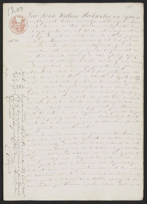 188 200 Voor Jozua Willem Hoekwater en zynen ambtgenoot, beiden keizerlyke Notarissen residee¬ rende binnen de stad Schiedam, hoofdplaats dan het vyfde Canton van het tweede Arrondissement van het Departement der monden van de Maas, Compa„ reerde Jan Bosman, deurwaarder by het vrede gerecht No. 73. van het canton schiedam, mitsgaders adjudant en exercitiemeester van de gewapende burgermacht de„ zer stad, wonende alhier op de korte agterweg Wyk N47 aan ons Notarissen bekend; Dewelke by deeze cedeert en transporteerd, zonder eenige garantie aan Johanna Molenbroek weduwe van Jacobus Soek, particuliere wo„ nende binnen deeze stad in de boterstraat Wyk E. No 150 153 meede aan ons Notarissen bekend, ten deezen tegenwoor dig en hetzelve transport accepteerende een somma van Ao 28 zes hondert en dertig francs (drie honderd guldens) zyn„ de een gedeelte van de prætensie groot twee duizend zes hondert acht en tachtig francs (twaalf honderd en tachtig guldens) welke den Comparant jan Bosman heeft tot lasten van den krygsraad der gemelde burger, macht, wegens by dezelde aan hem verschuldigd tracte„ ment door de waarneming zyner voorschreevene functie als adjudant en exercitiemeester Ten einde door de voornoemde Johanna Molenbroek we„ duwe Soek, van de gemelde krygsraad de voorschreevene zes honderd en dertig francs (drie honderd guldens) te ont¬ vangen en de betaling daar van te vorderen langs dezelde weegen, en door dezelde middelen, als waar toe hy Cidant zelve gerechtigd was, mitsgaders ten einde dezelve we„ dunle Jacobus Soek de voordeelen dezer tegenwoordige overdragt zoude kunnen genieten, daar meede doen en daar oder beschikken als met en over een zaak aan haar in vol„ komen eigendom toebehorende, zo steld en surrogeerd den voornoemden Jan Bosman dezelve weduwe soek in al„