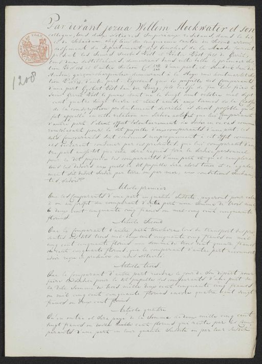 Par devant jozua Willem Hoekwater et son collique, tous deux Notaires Imperiaux residans, dans la vil„ le de Schiedam, chef lien du cinquieme canton du second arron„ dissement du Departement des bouches de la Meuse furent present les Sieurs Jacobus Post et Pieter Post fils de Gerrit, tous deux distillateurs, demeurans dans cette tille le premier sei tion B N 128 et l'autre Section Cor 219 d'une part, et Hendrik van der 211 Honden, garçon-charpentier demeurant à la Haye rue houtmarkt sec„ tion P N.o 18, d'autre part. Exposant que le pupille des Comparants 208 d’une part Gysbert Post van der Burg, fils laissé de feu leur frère le Sieur Gerrit Post le jeune etant ne le dingt huit octobre mil sept cent quatre vingt treize et etant ainsi aux termes de la Classe de la conscription presentement decritée is seroit possible qu'il fut appelle en cette relation au serdice actif et que lui Comparant d'autre part s'etant offert volontairement de Serder en ce cas comme remplacant pour le dit pupille d'enx comparants d'une part, les dits Comparants sont convenus reciproquement à cet effet comme ils declarent condenir par ces presentes, que lui comparant d'au tre part aussi-tot que cela sera requis fera le service personnel pour le dit pupille des comparants d'une part et qu'il remplira tous les dedoirs aux quels le dit pupille sera alors tenu et ce egale ment s'il dedoit serder par terre ou par mer, aux conditions suidan„ tes, Sadoir Article premier dire les Comparants d’une part en qualité susdite payeront pour cela à on au profit du comparant d'autre part une somme de trois nul le deux cent cinquante cinq francs ou mil-cinq cent anquante Horins. Articte Second Que le Comparant d'autre part touchera lors du transport des pre„ sentes des dits trois mil-deux cent cinquante cinq francs ou mil cinq cent cinquante florins une somme de trois cent quinze francs ou cent cinquante florins, que le comparant d'autre part reconnoit advir reçu en presence de nous Notaires. Article trois Que le Comparant d’autre part recedra la jour de Son depart pour faire le service pour le dit pupille des comparants d'une part de la dite somme de trois mille deux cent cinquante cinq francs ou mil cinq cent cinquante florins encore quatre cent vingt francs ou deux cent florins Artocle quatre Qu'en ontre il sera payé de la somma de deux mille cinq cent vingt francs ou douza mille cent florins qui reste par les Com„ parants d'une part en leur qualite susdite ou par leur susdit