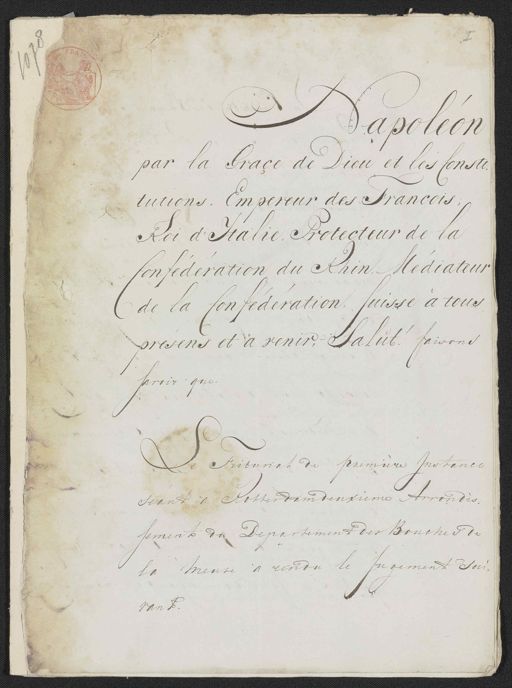 Capoléon par la Grace de Dieu et les Consti¬ tutions. Empereur des Francois; Roi d'Italie. Protesteur de la Confédération du Rhin. Mediateur de la Confédération Suisse a tous presens et à venir, Salut! faisons savoir que. Le Fritunal de premiere Instance séant a Rotterdam deuxieme Arrondis. sement du Departement des Bouches de la Meuse a rendu le jugement sui„ van E.