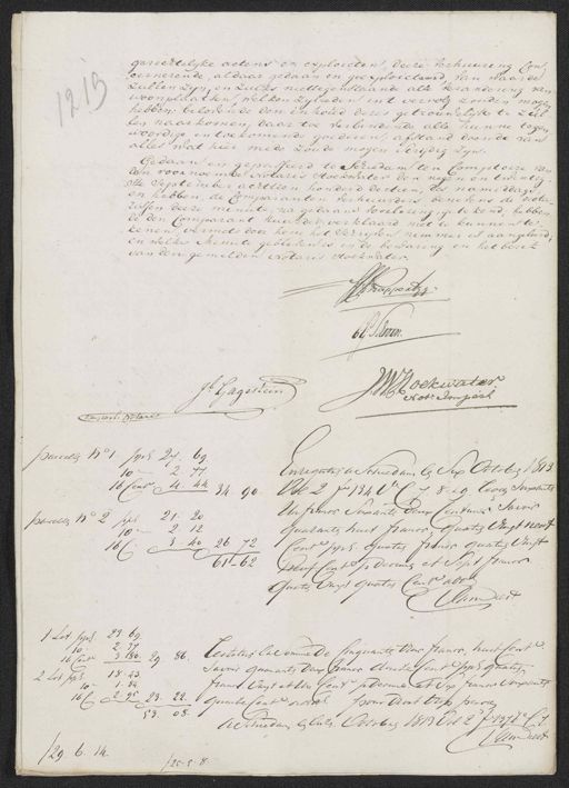 gerechtelyke actens en exploicten, deeze verhuuring Con„ cernerende, aldaar gedaan en geexploicteerd van waarde zullen zyn, en zulks niettegenstaande alle verandering van woonplaatsen, welken zylieden in 't vervolg zouden mogen hebben; belovende den inhoud dezes getrouwelijk te zul¬ len naarkomen, daar toe verbindende alle hunne tegen woordige en toekomende goederen; afstand doende van alles wat hier mede zoude mogen strijdig zyn Gedaan en gepasseerd te Schiedam ten Comptoire van den voornoemde Notaris Hoekwater den negen en twintig¬ ste september achttien honderd dertien, des namiddags en hebben, de Comparanten verhuurders benevens de nota¬ rissen deeze minute, na gedaane voorlezing, getekend; hebben de den Comparant huurder verklaard niet te kunnen te¬ kenen, vermits door hem het schryven nimmer is aangeleerd en welke Minute gebleven is in de bewaring en het bezit van den gemelden Notaris Hoekwater Mynappertig G: Schoorn. J:V:hoekwater Jb. Gagestein Nots. Impert. Keperl. Notaris parvell No. 1. Iph. 27. 69. Enregistre a Schildam le Six Octobre 1813. 2. 10 16 Cent. 4. 44 34 90 Ve 2 fo 134 VC. 7. 8. 29. Twee Soixants Un francs soixante deux Centimes savoir paroellen No 2 ppl 21. 20. Guaranten huis frunor, quatie vuyt neuf 2. 12. 18 Cente. Jph. Quatres franor quatres vrugt 3. 40 26. 72 16C Neuf Cento 1/1 decimo et Sept francs. 61-62 Quitie vuyt quatre Cente adol Clamest 1 Lot syph. 28. 69. 2. 16 Cent: 3. 7/80. 29. 86. Testitur la somme de Cinquante trois francs, huit Cent.l savoir quarante deux francs deze Cente pph. quatres 18. 43 2 Lot pps. francs vuijt et Un Cent p derune. et six francs six cents 10.1.84. 2 23. 22. Guinze Cente. adat. pour droit trop peroie 16C 53.08. A Schiedam en Onzen. Octobre 1813 Vol 2 ƒ 1371 C.7. Hendrik ƒ29.6.14 ƒ25.5.8.
