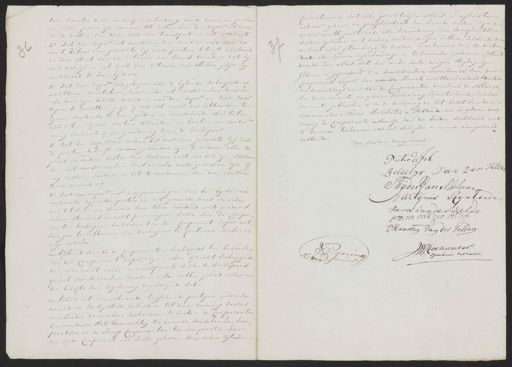 ten waartoe deeze verkoop aanleiding zoude kunnen geeden en welke gewoonlyk koomen tot lasten dan den koper als mee de de kosten van deeze acte van transport en het afschrift 2.o Dat den koper het voorschreeven huis en erve voor zo deel de door hem gekochte vyf zesde parten betreft aandaard in den staat waar in het zelde zich thans bedind en dat hy zich dadelyk in het bezit van het zelde zal stellen gelyk hy verklaard te doen bij deeze 3.o Dat den koper zal gedogen alle de lydende, verborgene of zichtbare servituten, waarmeede het voorschreeven huis en erde kan zijn belast, behoudens aan den kopes om zich daar tegen te verzetten gelyk hy ook het recht zal hebben om ten zynen voordeele te doen gelden de heerschende servituten alles ten zynen kosten, schaaden en baaten en zonder eenig verhaal of terugvordering tegen de verkopers consenteeren dat alle gerechtelijke actens en exploicten aldaar gedaan en geexploicteerd van waarde zullen zyn en zulks niettegenstaande alle verandering van woonplaatsen welken zyliaden in ’t vervolg zouden mogen hebben, belovende den inhoud dezes getrouwelyk te zullen naarkomen daar toe verbin dende alle hunne tegenwoordige en toekomende goederen afstand doende dan alles wat hier mede zoude mogen strydig zyn Gedaan en gepasseerd ten voorschreeven woonhuize van den Comparant koper den zevende Maart achttienhonderd veertien ses voormiddags en hebben de Comparanten benedens de Notaris sen deeze minute na gedane doorleezing onderteekend, welke minute gebleeven is in de bewaring en het bezit van den voornoemde Notaris Hoekwater - Hebbende na de gedane voor„ lezing de Comparante Mensse van der velden verklaard niet te kunnen teekenen als het schryden nimmer aangeleerd hebbende. 4.o Dat den koper, voor zodeel de door hem gekochte vyf zes„ de parten betreft, zallen gehouden zyn te voldoen alle de grond en andere lasten van welken aart die ook zyn welken van het voorschreeden huis en erve reeds geheeden zyn of nog zullen worden en dat te reekenen van den eersten dezer maand af 5.o Dat den koper voor kooppenningen van de by deeze verkochte vyf zesde parten in het gemelde huis en erde zal betalen een somma van twee honderd acht guldens zeven stuiders en acht penningen, welke som de Compa ranten verkopers verklaren dan den Comparant koper ont vangen te hebben en hem deswegens te quiteeren zonder ee nige reserve Afstand doende de Comparanten verkopers ten behoeden van den Comparant koper zyne erden of recht verkrygende van alle recht actie en aanspraak welke de verkopers op het voorschreeden huis en erde hebben gehad alles on„ der belofte van vrywaring ingevolge de wet. Aldus het vorenstaande tusschen de partyen geconde„ meerd en vastgesteld, dewelken tot naarkoming deezes hunlieder domicilien verkiezen te weeten de Comparanten binnen deeze stad woonachtig ter hunner voorschreeven woon plaatsen en de overige Comparanten ter woonplaatse van den vyfde Comparant aan welke gekozen domicilien zylieden drie woorden doorgehaald Pieter de Pel Belielje Van Den Velde¬ Sander van Alphen Hartijnus Rijnbende Sara van der Velde Jozina van der Velden Maarten Van der Velden Hoekwater Franning W„m openbaar notaris. Notaris Junior