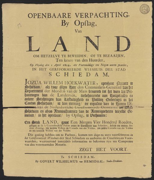 VERPACHTING, OPENBAAREN Opslag, By Van 4 19 M OM HETZELVE TE BEMEIDEN, OF TE BEZAAIJEN, Ten keuze van den Huurder, Op Vrydag den 1 April 1814, des Voormiddags ten Negen uuren praecies, IN HET GEREFORMEERDEWEESHUIS DER STAD SCHIEDAM. JoZUA WILLEM HOEKWATER, openbaar Notaris te heb Schiedam / als door Myn Heer den Commissaris-Generaal van het Departement der Monden van de Maas benoemd tot het doen der Ver¬ huuringen van de Landeryen, toebehoorende aan Hospitaalen en andere Stichtingen van Liefdadigheid en Publicq Onderwys in het Nots. Drye Canton Schiedam / is van meening / ter requisitie van de Heeren Di- geenen van de Nederduitsche Gereformeerde Gemeente der Stad Schiedam en alzoo Administrateurs van de Armengoederen derzelve Ge- meente / in het openbaar / by Opslag, te Verhuuren: Een Stuk LAND, groot Een Mergen Vier Honderd Roeden, gelegen in de's Gravenlandsche Polder onder de Jurisdictie van Schiedam, belend ten oosten An¬ dries Zondag, ten westen Willem en Cornelis van der Velden, ten zuiden Cornelis van der Volden en ten noorden Willem van der Velden Die gading hebben om te Pachten, komen ten dage en uure voorschreven in het Gereformeerde Weesbuis der Stad Schiedam en aanhoren de Conditienen Voor- waarden, waarontrend inmiddels informatien te bekomen zyn ten Comptoire van den voornoemden Notaris. ZEGT HET VOORT. Te SCHIEDAM, By GoVERT WILHELMUS van HEMSDAAL, Stads-Drukker.