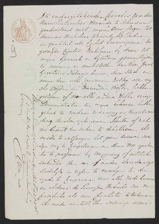 Ik ondergetekende Cornelis van den Ham Particulier wonende te Schiedam geadsisteerd met myne Oom Steven Hel derman Winkelier Wonende Rotterdam in qualiteit als bij het Emancipeeren toe gevoegde Curator Verklaare bij deeze tot 9 mijne Generale en bijzondere gemagtigde te noemen en aantestellen den Heer Jacob Gugestein Notaris binnen deze Stad: en omme van alle personen welke over mij als voogden en toezienden Voogden hebben gestaan of van alle andere welke eenige Edele administratien ten myne behoeven hebben gehad te vorderen rekening en verantwoor„ -18 ding dezelve op te nemen. Sluiten of wel na bivend van zaken te debatteeren, als mede te ontfangen het geene beweeren zal zyn mij te Competeeren en daar voor quitan tie te passeeren, bij weijgering of uitstel zoekende van een of ander de zodanige dadelijk in regten te navolgen ten dien eynde te Compareeren voor alle vrede bureau¬ GvN x en aldaar de Processen Verbaals zoo van Consiliatie als non Consilatie te tekenen als mede aan te stellen zodanige Avonds