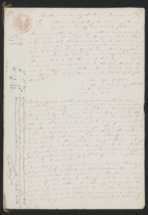 fo te Bestuur van de registratie en Domeinen Extract uit het Register van aangifte aan¬ gaande de verkoop van roerende goederen. Heden den achttiende January achttien honderd veertien compareerde in dit kantoor de Heer Jozua Willem Hoek water Notaris te Schiedam dewelke verklaarde voornemens No. 104 te zyn denzelfden dag des namiddags ten drie uuren pu„ bliek te verkopen een party aftraak en Brandery goederen stukken zakken etc: behorende aan de erfgenamen van Adriana Verkerk wede. Hermanus Uilenberg en Engeli¬ na Verkerk ongehuurd wonende te Utrecht, Hendrik Ver„ kerk te Enkhuijzen en Aletta Maria Verkerk weduwe Jan Heyligers j.r te Schiedam en heeft getekend. (get:d) J: W: voor kopie Conform Hoekwater De ontvanger van de registratie kantoor Schiedam (get) van Diest. In den Jaare achttien honderd veertien den tot achttiende januarij des namiddags ten drie uuren ten verzoeke van de Erfgenamen van Adriana Verkerk weduwe Hermanus Uylenberg wonende te Amsterdam en te Ut„ recht en Engelina Verkerk zynde ongehuwd, wonende te Utrecht, Hendrik Verkerk wonende te Enckhuyzen en Alet„ ta Maria Verkerk weduwe van Jan Heyligers Junior, wo nende te scheedam, zal door Jozna Willem Hoekwater en zynen Ambtgenoot beiden openbaare Notarissen reside„ rende binnen de Stad Schiedam, Hoofdplaats van het vyf de canton dan het tweede Arrondissement van het de„ partement der monden van de Maas worden overgegaan tot de openbaare verkoping by opbiedingen van de goederen hier onder te vermelden. Deeze verkoping zal geschieden in en voor een Brandery geleegen aan de noordvest der stad schiedam wyk N.o alwaar de voorschreevene goederen zich bevinden en waar heenen wy ondergeteekende notarissen ons ten einde voor noemd begeeden hebben; En hebbe wij vervolgens in te„ genwoordigheid van de aldaar te samen gekomene persoo„ nen na aan hun te hebben gecommuniceerd dat de ge¬ melde verkoping geschied onder conditie dat de betaling