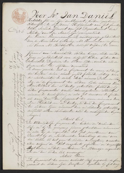 Voor Mr: Jan Daniel ockwater swz en zijn ambtgenoot, beiden openbare Notarissen, te schiedam, Hoofdplaats van het Cantog twede Arrondissement van het Departement der N. 6 Monden van de Maas, zijn gecompareerd. Jan Vormer, Timmermansgezel„ minderjarig, geddsisteekd door de Heren Jacob Gondelag, Mr. Timmerman en Cornellis Vormer Mr Broodbakker, deszelfs voogden, ter eenreEn Johannes van Maarledeld, zonder beroep, mede minder jarig en geadsisteerd door deszelfs vader, Pieter van Maarleveld; Dagloner, ter andere zijde, wonende alle de Comparanten te schiedam voornoemd. Te kennen gevende dat de Comparant ter eenre in de op den Vierden dezer plaats gehad hebbende Loting voor de Landmilitie te dezer Stede numero Drie - en Zeven „tig, en de Comparant ter andere zijde numero Veertien Honderd Een en dertig getrokken hebbende, hij beiden Comparanten waren overeengekomen elkanders nummer te verwisselen, en alzo het daarvoor te houden als ware door den Comparant ter eenre numero veer„tien Honderd een en dertig, en door den Comparant ten andere zijde numero drie en zeventig getrokken en Lulks onder observantie van de navolgende bepalingen. Articul Een. De Wederzijdsche Comparanten beloven en verbinden zich, om bij te oproeping hunner getrokkene nummers en alzo bij de requisitie tot het presteren van Dienst bij de Landmilitie wederkerig de een voor den ander al dat geen te zullen verrigten; waartoe ieder volgens de Wet enigsints gehouden en verplikt stegt wezen, en dat, mitsdien in zodanige requisitie De een den ander zal vervangen. Articul Twee De Comparant ter eenre verbindt Lich, ingevalle de Comparant ter andere zijde krachtens bepaalde bij het vorig