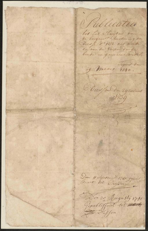 Regionaal Archief Tilburg, archieftoegang 694, Dorpsbestuur van Diessen, 1677 - 1810., inventarisnummer 2, STUKKEN VAN ALGEMENE AARD, Publikaties door de regenten, 1732 - 1744