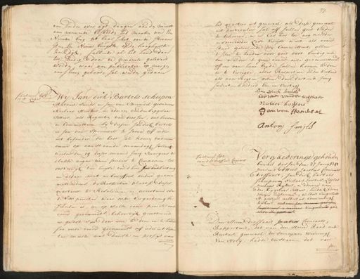van heeden over agt daagen aan den minst aan neemende besteeden het maaken van een Nieuwe brug tot baas schot over de stroom Item een Nieuw brugske op de haaghopste kerk dijk, sullende al het hout daar toe nodig door de gemeente geleverd worden, waar van publicatie op morgen aansheeren gebood, sal werden gedaan Wy Jan dirk Bartels scheepen Antonie Smids en Jan van Spreuwel gesworens Niclaas Heesters, en adriaan van den biggelaar setters, als Regenten van diessen, authoriseren en Committeren bij deesen Jan dirk bartels en Jan van Spreeuwel te saame off ieder uit besonder die best sal konnen vaceeren omme op aanstaande maandagh sullende weesen den 19 deeser maand Junij smorgens de clokke negen ueren precies te Compareren tot oosterwijk ten huijse van d'heer stadhaude hart ong en aldaar met en beneffens andere gecom¬ mitteerdens der Respective plaatse deeses quartiers te Resolveeren en arresteren oder de vier poincten waar op de vergaedering be „schreden is, en op welke voors: poincte onse voors: gecommit:s behoorlijk geinstrueerd en gelast sijn daar inne te doen en te handen soo onse voors: gecommitt: off ieder int besond ten meeste nut dienste en profijt van factum Est 12 st zegel 37. het quartier int generaal als deese gemeente in't particulier sal off sullen goet vinden te behooren, en in cas hier toe nog naerder en speciaalder Last vereijst wiert als voors. staat geloodende (Wij Committenten allen t selve te houden voor goet vast bundig ende van weerden t geene voors. onse gecommitteerd off een van haar beijde sullen koomen te doen en te verrigte, alles Respective onder verband als naar Regten actuur den dartiende Junij seeventienhonderd Een en veertigh Jan Dirck Bartels adriaen vanden bichelaer Niclaes heesters Jan van Spreuwel Antonj Smits Vergaederinge gehouden binnen diessen den 27 Junij 1741 presens d Heer Jacobus Coenraats droffaart, Jan dirk bartels scheepenen Niclaas heesters, Luijcas Niclaas Rijkers, en Adriaan van den, biggelaar setters, hendrik adriaen pluijm huijsarmr. en wilbort vingerhoedt Hr. geestmr. aelbertus Couwenbergh kerkenr:, antonie Jan maand gewesenen huysarmen en neelaars vingerhoeds ge¬ wesen Hr. geest mr. Den Heere drossaart Jacobus Coenraets Rapporteert, dat van den Heere Raad ende Rentmr. generaal der domeijnen weveringh van Holij, hadde verstaan, dat voor verte factum Est voor d hr. drossard Coenraets