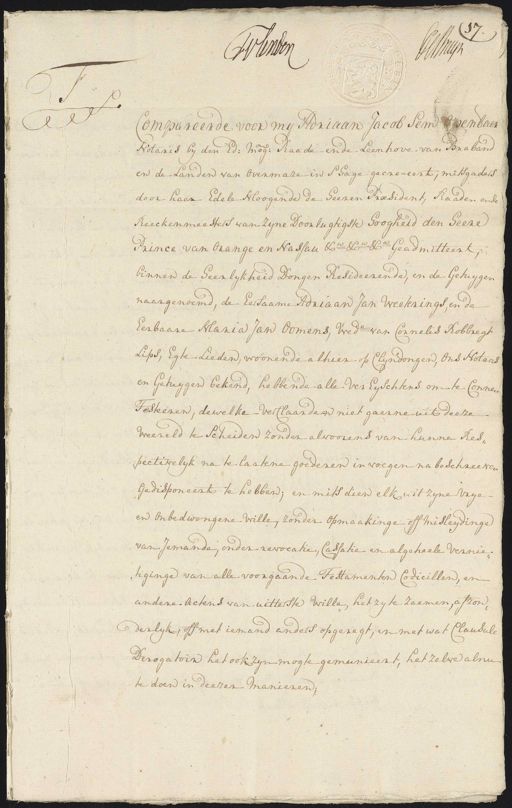 in Fvlinden Compareerde voor my Adriaan Jacob Sem Openbaer notaris bij den Ede: Mog: Raade ende Leenhove van Braband en de landen van overmaze in ’s Hage gecreeert, mitsgaders door haar Edele Moogende de heeren praesident, Raaden ende Reeckenmeesters van zijne Doorlugtigste hoogheid den heere Prince van Orange en Nassau &a &a &a geadmitteert binnen de heerlijkheid dongen resideerende en de getuijgen naargenoemd, de Eersaame Adriaan Jan Weeterings, en de Eerbaare Maria Jan Oomens, wede. van Cornelis Robbregt lips, Egtelieden, woonende alhier op Clijn dongen, ons Notaris en getuijgen bekend, hebbende alle vereijschtens om te connen testeeren, dewelke verclaarden niet gaerne uit deeze weereld te scheiden zonder alvoorens van hunne res¬ pectivelijk na te laatene goederen invoegen nabeschreeven gedisponeert te hebben, en mitsdien elk uit zijne vrije en onbedwongene wille, zonder opmaakinge off misleijdinge van Iemande, onder revocatie, cassatie en algeheele vernie¬ tiginge van alle voorgaande testamenten Codicillen en andere actens van uitterste wille, het zij te zaemen afzon derlijk, off met iemand anders opgeregt, en met wat clausule Derogatoir het ook zijn mogte gemunieert, het zelve alnu te doen in deezer manieren;