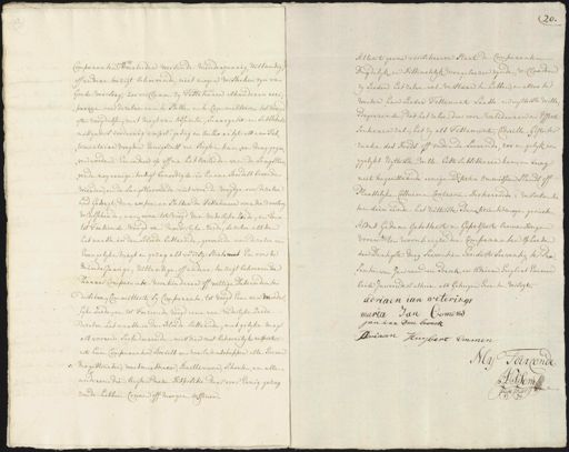 respve Comparanten overleeden weesende minderjaarig, uitlandig, off andere toezigt behoevende niet mogen versteeken zijn van Goede Voorsorg, zoo verclaaren zij Testateuren elkanderen reci¬ proque over dezelve aan te stellen en te committeeren tot voogd ofte voogdesse, met magt van assumtie, surrogatie en substitutie mitsgaders zoodaenig ampel gesag en authoritijt als aan Tes¬ tamentaire voogden eenigsints na regten kan en mag gegee= ven worden. En indien op off na het overleiden van de langstlee¬ vende nog eenige toesigt benoodigde in hunne boedels bevonden wierden en de langstleevende niet voor de voogdije over dezelve had gesorgt, dan roepen en stellen de Testateuren over die voorsor= vereijsschende, aan eene tot voogd van vaderlijke zeide en eene tot toesiende voogd van moederlijke zeide, dezelve als dan het naaste in den bloede bestaande, geevende aan dezelve een Evengelijke magt en gezag als voorsz: staat en over de minderjaarige uitlandige off andere toezigt behoevende haarer comparante voorkinderen off wettige Descendenten derselve committeert sij Comparante tot voogd eene van moeder= lijke zeide, en tot toeziende voogd eene van vaderlijke zeide dezelve het naaste in den bloede bestaande, met gelijke magt als vooren secludeerende mitsdien met behoorelijk respect uit hun Comparanten boedels en naarlatenschappen alle heeren magistraaten, weesmeesteren, bailliuwen, schouten en alle anderen die buijten deeze dispositie daar over eenig gezag zoude hebben connen off moogen oeffenen. 20. allen tgeene voorschreeve staat de comparanten duidelijk en distinctelijk voorgeleezen zijnde, verclaarden zijlieden hetzelve wel verstaan te hebben en alzoo te weesen hun lieder Testament laaste en uytterste wille begeerende, dat hetzelve daer voor valideeren en Effect sorteeren zal, het zij als Testament, Codicille gifte ter zaake des doods off onder de leevende, zoo en gelijk een ijgelijks uijtterste wille best subsisteeren kan en mag nietteegenstaande eenige defecten ommissien ’s lands off plaatselijke Costume contrarie dicteerende; versoekende ten dien einde het uitterste beneficie te mogen genieten Aldus gedaan getesteert en gepasseert binnen dongen voorn ten woonhuize der comparanten op heeden den Dartigste Meij seeventien hondert seeventig te prae= sentie van Jan van den Broek, en Adriaan Huijbert emmen beide inwoonders alhier als getuigen hier toe versogt. Adriaen ian weterings Maria Jan Oomens Jan van den broeck Ariaan Huybert Emmen Mij Toirconde A:J:Sem Nots: Publ: 1770