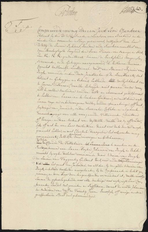 een Fvlinden Compareerde voor mij Adriaan Jacob Sem Openbaer Notaris by den Ede: Mog: Raade en Leenhove van Braband en de Landen van overmaze in shage gecreeert, mitsgaders door haer Ed: Mog: de Heeren President, Raaden ende Reeckenmeesters van zyne Doorlugtigste hoogheid den Heere Prince van Orange en Nas¬ van &: &: &: geadmitteert binnen de heerlykheid dongen, Re¬ sideerende, en de Getuigen naargenoemd, de Eerbaere Maria Cornelis Anthonisse Laastmaal wed van Adriaan Rijnier van Kuijk, woonende onder deeze Jurisdictie op de Breestraat, ons Notaris en Getuigen en bekend, hebbende alle vereijschtens om te connen testeeren, dewelke betuijgde niet gaerne deezer wee¬ reld te willen overleiden zonder eerst en alvooren gedisponeert te hebben van haare na te laetene goederen, en mitsdien uyt haare vrije en onbedwongene wille, zonder opmaakinge, off mis¬ leydinge van Iemande, onder revocatie Cassatie en algeheele vernietiginge van alle voorgaande Testamenten Codicillen off eenige andere actens van uijtterste wille die zij afzonder lyk off met een van haer overleedene mans voor dato deezes mogte gemaakt hebben, en met Clausule derogatoir het ook weesen opnieuws gemunieert, zulks (te doen invoegen nabeschreeven; Eerstelyk verclaarde de Testatrice te maaken en te Prelegateeren aan haare Dogter Johanna van Kuijk in Echte verwekt by wylen derselver voornoemde man Adriaen van Kuijk eenige de somme van Taggentig Guldens Eens, voor ende tot voldoeninge van alle het gunt den Imboedel zoo als die bij den gem: Adriaen van kuyk intestato overleeden naergelaaten, by de Comparante in besit ge¬ noomen en door haer door teegenspoeden vermindert is, welke voorsz: somme de geprælegateerde voor alle deelinge voor uijt, uijt haar Com¬ paranten boedel zal genieten en proffiteeren zoo ras de voorn: Johanna ten ouderdom van vijff en twintig Jaeren huwelijk off eenige andere geapprobeerde staat zal gekoomen zijn.