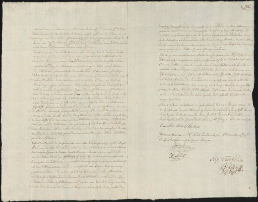 als dan daar en boven aan hetzelve kind off kinderen off wettige descendenten bij representatie te zaemen uijt te rijken en te voldoen in vol¬ doeninge van hun vader off moederlijk goed bewijs off legitime Portie de somme van vijffentwintig guldens eens, dezelve daerinne institueeren en tot haare Erffgenaeme benoemende bij deeze voorts verclaaren de Testateuren in alle haare nae te laetene vaste onroerende goederen geene daarvan uitgezondert, mitsgaders in de laaste roerende goederen zoo verre deze op het overleeden van de langstleevende zullen nog in weesen zijn te institueeren met volle regt en titule van justitutie hun Testateuren gesaementlijke verwekte kind off kinderen off wettige Descendenten bij representatie, om allen dezelve goederen na doode van de langstleevende te aenveerden en daarmeede te doen en handelen als met vrije eijgen goederen; Ende indien het gebeurde dat op het overleiden van de langstleevende egeene kind off kinderen off wettige oiren deselve in leeven waeren, willen en begeeren de Comparanten dat in zoodaenig geval hier testateuren vaste goederen als dan zullen moeten devolveeren en geerfft worden, namentlijk de oude aanbestorvene off geerffde goederen ter zeijde waart daar dezelve van voortgekoomen zijn en de staande huwelijk geconquesteerde, neevens de roerende goederen zoo verre deeze laaste door de langstleevende zullen worden nagelaeten de eene helft bij de vrienden van den Testateur ende andere helft bij de vrienden van de Testatrice die agtervolgens het successie en versterfregt deeze Baronnie als dan zullen bevonden worden daer toe geregtigd te wee¬ sen dezelve in het voorsz: geval daarin met volle regt en titule substitie eerende bij deeze wijders verclaaren de comparanten over alle minderjaarige uijtlandige andere toezigt behoevende welke in haar Testateuren nalaetenschap pen mogten coomen te erven malkanderen reciproque over dezelve aan te stellen tot voogd off voogdesse met magt van assumtie surrogatie en substitutie en voorts zoodaenig ampel gezag en authoritijt als aan testamentaire voogden eenigsints na regten kan en mag gegeeven worden. En indien op het overlijden van de langstleevende nog toezigt vereijsschende in hunne boedels bevonden wierden, dan com¬ mitteeren en stellen zij Testateuren over dezelve aen eene tot voogd van van derlijke zeide, in eene tot toeziende voogd van moederlijke zeide, welke de 56. voorsorg vereijsschende het naaste in den bloede zullen bestaan eevende aan dezelve een evengelijke magt en gezag als voorsz: is mitsdien met behoorelijk respect uijt hun Comparanten boedels en nae¬ laetenschappen secludeerende alle heeren Magistraeten, weesmeestere bailliuwen, schouten en alle andere die buiten deeze dispositie daerover eenig gezag zoude hebben connen off mogen oeffenen. allen tgeene voorschreeve staat den comparanten duijdelijk en distinctelijk voorgeleezen zijnde, verclaarde zijlieden hetzelve wel ver= taan te hebben en alzoo te weesen hun lieder Testament laaste en uijtterste wille, begeerende, dat hetzelve daervoor valideeren en effect sorteeren zal, het zij als Testament, Codicille, gifte ter saeke des doods off onder de leevende zoo en gelyk een ieders uytterste ville best subsisteeren kan en mag nietteegenstaande eenige de= secten, missien, ’s lands off plaatselijke costumen contrarie dictee= rende; versoekende ten dien eijnde het uitterste beneficie te nogen genieten. Aldus gedaen getesteert en gepasseert binnen dongen voornt ten Comptoire mijns Notaris op heeden den Seevende Junij 17& een en seeventig, ter presentie van de heer Jacobus François van Alphen en Hendrik Schut, beide inwoonders alhier als getuijgen hier toe versogt. Cornelis Jan Claesen dit neevenstaende is het handmerk van Pieternella Claes Bressers verclaerd niet te connen schrijven. J:F:V:Alphen H: Schut Mij Toirkonde A:J:Sem Nots: Publ 1771
