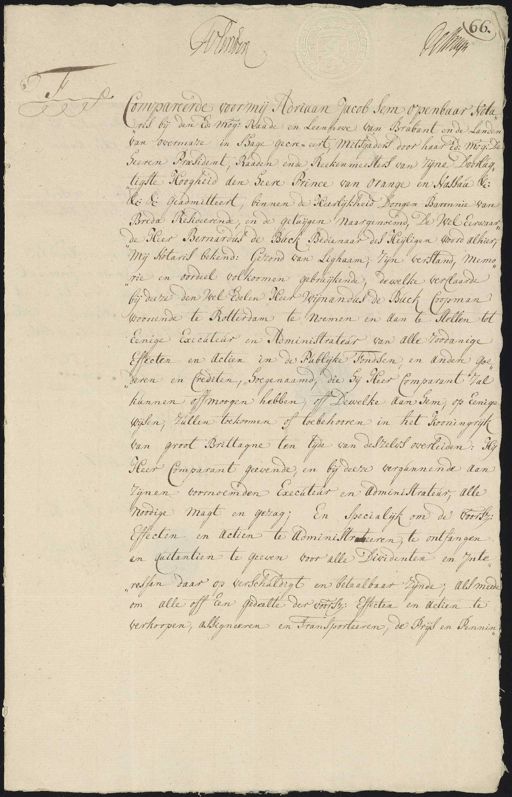 66. in Fvlinden Compareerde voor mij Adriaan Jacob Sem openbaar Notaris bij den Ed: Mog: Raade en Leenhove van Brabant en de landen van overmaze in shage gecreeert, mitsgaders door haar Ed: Mog: de Heeren Praesident, Raaden ende Reekenmeesters van zijne Doorlugtigste Hoogheid den heere Prince van Orange en Nassau &c: &c: &c: geadmitteert binnen de heerlijkheid dongen Baronnie van Breda resideerende en de getuijgen naergenoemd, de wel eerwaar= de Heer Bernardus de Buck bedienaar des heijligen woord alhier mij notaris bekend gezond van lighaam, zijn verstand, memo= rie en oordeel volkoomen gebruijkende, dewelke verclaarde bij deeze den Wel Edelen Heer Wijnandus de Buck Coopman woonende te Rotterdam te noemen en aan te stellen tot eenige Executeur en Administrateur van alle zoodanige effecten en actien in de publijke pondsen, en andere goederen en crediten, hoegenaamd, die hij Heer Comparant zal kunnen off moogen hebben, off dewelke aan hem op eenige wijsen, zullen toekoomen of toebehooren in het kooningrijk van Groot Brittagne ten tijde van deszelvs overleiden. Hij Heer Comparant geevende en bij deeze vergunnende aan zijnen voornoemden Executeur en Administrateur, alle noodige magt en gezag, en specialijk om de voorsz: effecten en actien te administrateeren, te ontfangen en quitantien te geeven voor alle dividenten en Interessen daar op verschuldigt en betaalbaar zijnde, als meede om alle off een gedeelte der voorsz: effecten en actien te verkoopen, assigneeren en transporteeren, de prijs en pennin=