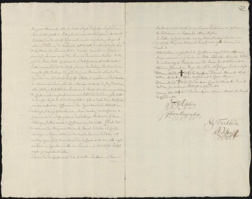 Dingena Adriaanse Maas, seeker slegt Parceeltje Saeijland en Schaarbosch groot in het geheel ontrent ses loopzaet ofte zoo als hetzelve door de voorsz: egtgenooten meede nagelaeten geleegen is alhier op d’ End aan de veepad, die oost is, west Jan Maas, zuijden hen= drik Adriaense Leermaekers, en noorden Cornelie en Catrien Cornelisse, Leenroerig aen den heer en Baron van Breda, Ende wijl de twee eerste comparante en des comparants voorn: vader hebben vermeend dat de voorsz: gedaene mondelinge declaratie van overgifte offte deelinge de gemelde Dingena Adriaense Maas in den eijgendom van het voorsz: parceeltje stelde, te meerder om dat dezelve en naeme van haere gemelde man Adriaan Andries de Jong daerinne op den 21 augustus 1761 ten Leenhove te Breda is verheeven geworden de comparanten nogtans vernoomen hebbende dat haere gem: zuster en moetje dugtende is, dat moogelijk in tijde en wijle door de compa¬ ranten respective Erffgenaemen dien eijgendom zoude betwist en desweegens moeijelijkheeden aangedaen worden, zoo verclaeren de comparanten de voorsz: gedaene mondelinge declaratie bij deeze publicque instrumente te confirmeeren, tot zulken effecte dat de voornoemde Dingena Adriaense Maas hetzelve parceeltje zal mogen en blijven besitten, en daermeede doen en handelen als met vrij eijgen goed, renuntieerende zij Comparanten van alle regt bantaal en eigendom, welke aan hun op en in het voorsz: Parceel mogte gecompeteert hebben Beloovende de Comparanten dese te zullen presteeren en doen presteeren onder verband van hunne persoonen en goederen ten bedwange en executie als na regten En hebben zij Comparanten aan mij Notaris versogt hier van aan de voorsz: Dingena Adriaense Maas, acte uijtte leeveren, die deese is Aldus gedaen en gepasseert ten Comptoire mijns Notaris binne dongen voornoemd op heeden den Sesden September seeventien hondert en en seeventig, ter presentie van de heeren Jacobus François van Alphen en Johannes van Baijen Sem, beide als getuijgen hier toe versogt Dit neevenstaende is het handmerk van Pieternel Adriaanse Maes wede. van Markus van Alphen verclaerd niet te connen schrijven dit neevenstaende is het handmerk van Cornelia Adriaense Maas wede. van Jan Anthonie Platuijt verclaerd uts:a dit neevenstaende is het handmerk van Adriaen Adriaense Maes verclaerd utsa J:F:V:Alphen J:van Baijen Sem Mij Toirkonde A:J:Sem Nots: Publ: 1771