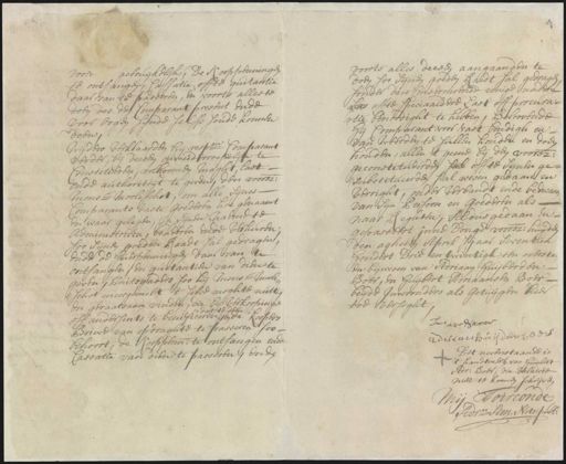 voord gebruijkelijk, de Kooppenningen te ontfangen cassatie offte quitantie daarvan te passeren en voorts alles te doen des de Comparant present ende voor oogen sijnde selffs soude konnen doen Wijders verklaarden hij respe Comparant verder bij deesen onweederroepelijk te Constitueren, volkoomen macht last ende authoriteijt te geven, den voorsz: Monsr Mooleschot, om alle sijnes Comparants vaste goederen hoe genaamt en waar gelegen in sijnen naeme te Administreren, bekeeren ende verhuren soo sijnen goeden Raadt sal gedragen ende de huerpenningen daar van te ontfangen, en quitantiën van dien te geven, mitsgaders soo hij monsr Moole¬ schot meergemelt ’t selve moghte nuttig en geraatsaam vinden, die bij verkoopinge dat te doen off andersints te benificeren, en de koopers brieve van opdraghte te passeren soo behoort, de kooppenn: te ontfangen ende cassatie van dien te passeren ende voorts alles deesen aangaanden te doen soo synde goeden Raedt sal gedragen sonder dies consernerende eenige nader offte speciaalder last off procura¬ tie benoodight te hebben, beloovende hij Comparant voor vast bondigh en van weerden te sullen houden en doen houden allen ’t geene bij den voorsz: geconstitueerde off te sijnen ge= substitueerden sal wesen gedaan en verright, onder verbandt ende bedwang van sijn persoon en goederen als naar Regten, Aldus gedaan en gepasseert inne donge voorsz: huijden den agsten April jaar seventien hondert drie en twintigh ten oversta en bijwesen van Adriaan Huijberden Boer, en Huijbert Adriaansen Boer beijde Inwoonders als getuijgen hier toe versoght ter Adiaan huijdenier Dit nevenstaande is t handtmerk van huijbert Adriaan Boes, die verklaerde niet te konnen schrijven Mij Toirconde Adr. hem Nots. Publ: