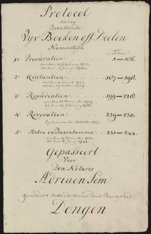 Regionaal Archief Tilburg, archieftoegang 930, Notariële archieven van de Gemeente Dongen, 1721-1935 , inventarisnummer 2, Adriaen Sem, Procuraties, quitanties, repudiaties, revocaties en staten en inventarissen (P-S)