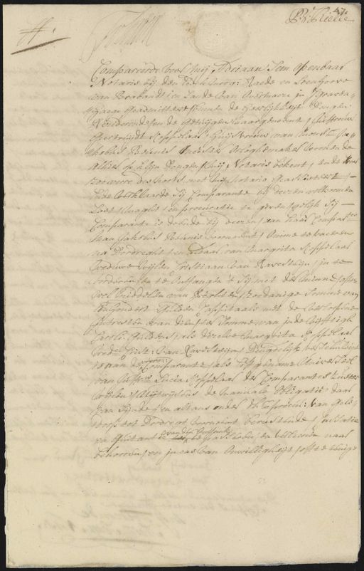 P: Ruelle de Compareerde voor mij Adriaan hem openbaar Notaris bij den Eedele Moog: Raede en Loenhooven van Brabandt, en lande van Overmaze in ’s gravenHaege geadmitteert binnen de heerlijkheijt dongen Reziderende en de getuijgen naargenoemt, Juffrouw Geertruijdt oppelaar huijsvrouw van Mons:r Jan kobus Beunis meester orloghemaker woonende alhier op klijn jongen, mij notaris bekent ende voor zoo verre des noots met mij notario geassisteert ende verklaarde zij comparante bij deezen volkoomen laet maght en procuratie te gevengelijk sij Comparante is doende bij deezen aan haar Compart man Jakobus Beunis voornoemt, omme te vaceren na Dordreght en daar van Margrita Koppelaar weduwe wijlen Cristiaan van Ravesteijn in te vorderen en te ontfangen ’t sij met de minne off wel middelen van vegten, zoodanige somme van Eenhondert gulden Cappitaale met de verloopene intresten van dien ter somme van in de vijfftigh Caroli Guldens als dezelve Margrita oppelaar wede Crist van Ravesteijn, deugdelijk verschuldigt voorsz: is pan de comparante als Erffgename universeel van juffr. Lucia Coppelaar de Comparantes zuster wijlen uijtwijsens de manuale Obligatie daar van sijnde en altans onder dh:r procus van gele= dorp tot Dordregt voornoemt berustende cassatie van den Ontfank en quitantie te te passeren en verleenen naar behooren en incas van onwilligheijt offte eenige
