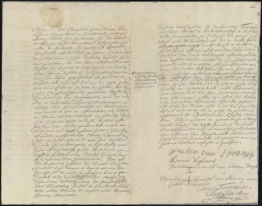 sterve den langhstleevende van hun beijde te nomineren en institueren, met volkoome Titule van Institutie soo des behoort tot eenige ende universeel Erffgenaem van allen de goederen, soo vaste als roerende haaffelijke als meubile en geene uijtgesonder van wat naeme offte natuere deselve soude mooge wesen, die den eerststervende mette doodt sal koomen te ontruijmen en naer te laten, Omme deselve bij de Langhstleevende van hun beijde geproffiteert en genooten te werden als sijn off haer vrij en eijgen goedt met dien last en conditie noghtans dat de selve langhstleevende gehouden blijfft de kinderen bij hen Comparanten aan den and den te verwekken, behoorlijk te alimenteren, en verders alles sooveel doenlijk tot bevorderinge van deselve te doen en effectueren, als eerlijke en pieuse ouders verplight en gehouden sijn ende sulcx tot tijdt en wijle deselve offte der van dien sullen geavanceert wesen ten Ouderdom van vijff aghtien jaere huwelijk off andere geapprobeerde staete, wanneer de selve langhstleevende aan ider derselver kinderen sal moeten geven en uijtreijken voor vader off moederlijk goedt de somme van Vijfftig guldens eens, deselve Kinderen daer op nominerende en Instituerende. Dan off het kwaeme te gebeure dat de voorn. langhstleevende sigh kwame te begeven tot tweeden huwelijk sal de voorsz: institutie koomen te Langstlevende cesseren ende deselve aff moete stappe ten helffte behoeve van deselve inderen de gereghtige van haer Testateuren boedel en naarlatenschap ende alleen behouden de toghte onder den voors. Last van slimentie wijders verklaarden sij comparanten Testateur uijt haren boedel en naarlatenschap te secluderen allen magistraete en Collegien die eenigh gesagh over de minderjarige die in deese soude mooge koome te herideren soude konne offte moge pretenderen (behoudens derselvester:) ende tot vooght offte vooghdesse van deselve te nomineren den langhstleevende voornt ende bij overlijden offte insufficantie van dien de naaste bloedtvrinden van sodanige minderjarige met naeme monsr. Wouter vermen een ende Jan van Sprangh, ende van haer Dit alles en Comparanten Testateuren voorgelesen sijnde, verklaarde sij also te wesen hare laasten en uijttersten wille ende Testament met begeerte dat hetselve, met vernietiging van alle vorige) alleen sijn effect sal sorteren t sij dan als een Testament, Codicille, gifte uijt saeke des Doodts offte onder den levende off wel andersints soo en gelijk een iegelijks uijtterste wille alderbest naer reghten bestaan kan. Aldus gedaan en getesteert inne dong voorsz: huijden den 29:e Jannuarij des Jaars seventienhondert vier en twintigh tot presentie van Adriaan van Dongen, ende Adriaan Jakob Marcus Inwoonders als getuijgen van geloove hiertoe versoght en geroepen Wouter van Sprangh Adriana Seijlmans Dit is het nantmerk van Adr van Dong Dit is het hantmerk van Adriaan Jakob Marcus mij Toirconde dra hem Nots 1724 testatrice beide, Jochem Zijlmans en Johannis zeilmans