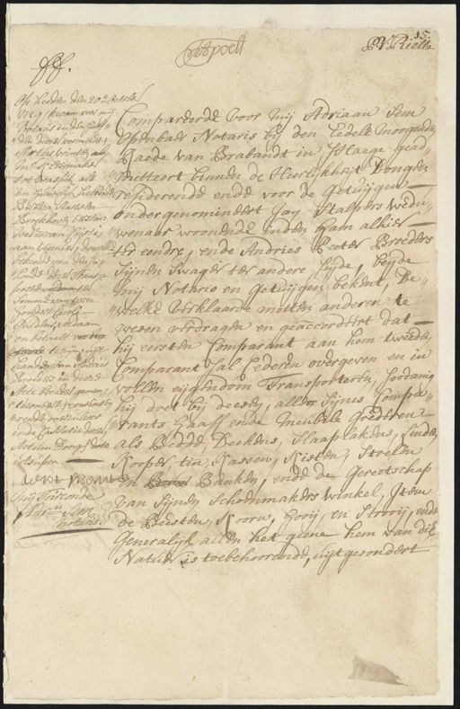 P: Ruelle Spoel Compareerde voor mij Adriaan hem Openbaer Notaris bij den Edele Moogende Raede van Brabandt in slaege gead= mitteert binnen de Heerlykheijt dongen residerende ende voor de getuijgen ondergenomineert Jan Stalpers wedu= wenaar woonende inden Ham alhier ter eendre ende Andries Pieter Broeders sijnen swager ter andere seijde, beijde mij Notaris en getuijgen bekent, de welke verklaarde metten anderen te wesen verdragen en geaccordeert dat hij eersten Comparant aan hem tweeden Comparant sal cederen overgeven en in vollen eijgendom Transporteren, soodanig hij doet bij deesen, alle sijnes Compa= rants haaff ende meubile goederen als bedde deekens, slaaplakens, Lind Kooper, tin, Kassen kisten, stoelen en Bos banken, ende de gereetschap van sijnen Schoenmakers winkel, Item de beesten, koorn, hooij, en strooij ende Generalijk allen het geene hem van die Natus is toebehoorende uijtgesondert Op heeden den 20e October 1729 kwam voor mij Notaris in den hoff den deeze vermeldt Artus Winte al¬ Mr. Kleermaker tot Waspik als in huwelijk hebbende Barbera Staatsen Broekhoven eerste wede. van Cristen aan vermeer, dewelke bekende van den in= houde deze Jans poste veldaaten somme van twee hondert Caroli guldens voldaan en betaalt te zijn uijt handen van Andrie Broeders in deeze Acte breeder gemen tioneert contente¬ rende oost zulcks in de cassatie derde Actum Dongs dato utsupra dert twee mij Toirconde Adr hem Notaris