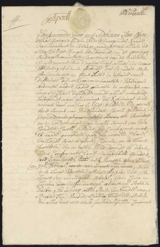 P: Ruelle pot Compareerde voor mij Adriaan hem open¬ waar notaris bij den Eedele moogen den Raede van Brabant in slaege geadmitteert binnen de heerlijkheijt dongen residerende en de getuijgen ondergenomineert Martinus van den nieuwen¬ huijre woonende in d’ agterhuijze alliede mij notaris bekent, te kennen gevende dat hij nadert eenen geruijmen tijt in sijne sack en affaires veele differente diensten, zoo in vacatiën, Besoignen als mede andere hadde genooten en ontfangen van Monsr Charl besheijde meede alhier woonende beloopende naar opneminge de Rekeninge ende accoort daarover zoo hij zeijde tusschen hen gevallen Eene somme van Driehondert Caroli guldens tot securiteijt en in voldoeninge van welke somme van drie hondert Caroli Guldens, hij Comparant was te raede gewerden aan den voorn: Charel verheijd over te geven, cederen, en te Frans¬ porteren, soo en gelijk hij is doende bij deezen, sijns Comparante haar en Meubile goederen Drie als namentlijk en melk beesten twee swarte Roode en een gemel, een stevent; ende drie leege beesten off veersen, een wit een swart en een swarte Gremel. Item Circa Circum ve vyffendartigh veertigh stokken Dien, en wijders allen sijnen imboedel van Kooper, Tin, Bedde, Cassen Taeffels, stoelen a en alles dat tot eenen Imboedel en hem Comparant